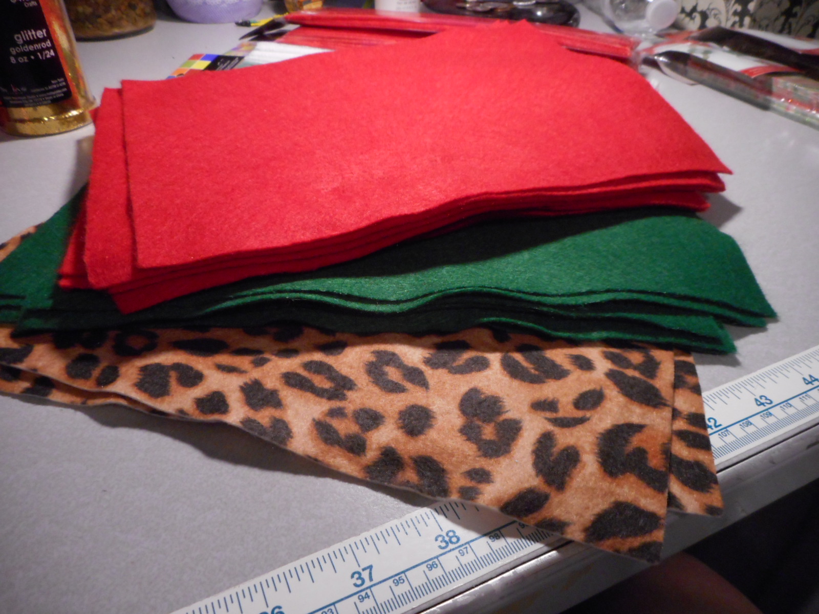 Of course, felt, red, green and yes, leopard print. I am working on some ornaments for our oldest daughters tree, theme, I am sure you guessed it, leopard print !