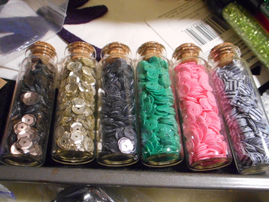 and of course I bought stuff this month, way more than I am showing. Got the seed bead tubes at Tuesday Morning for a buck each and the glass jars of sequins at Hobby Lobby at half off for a buck each. Got all the beads in front of the tray for 7 bucks at the thrift store. she saves up for me and had some goodies for me to go through and gave me a great deal !!
