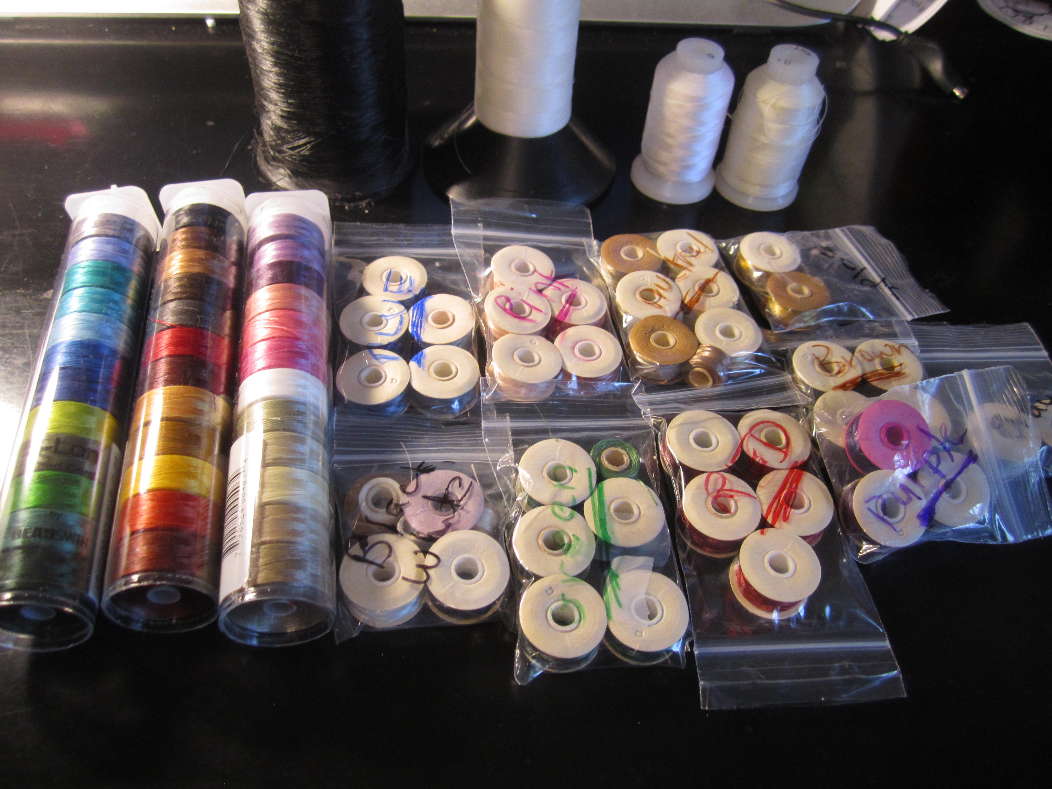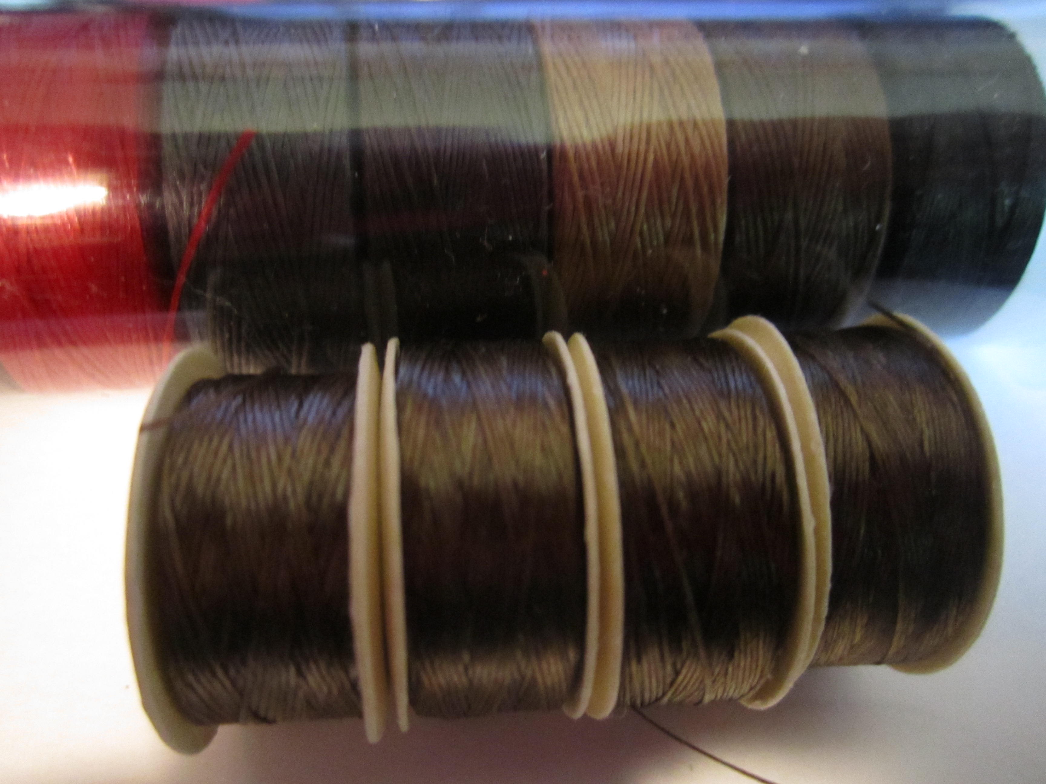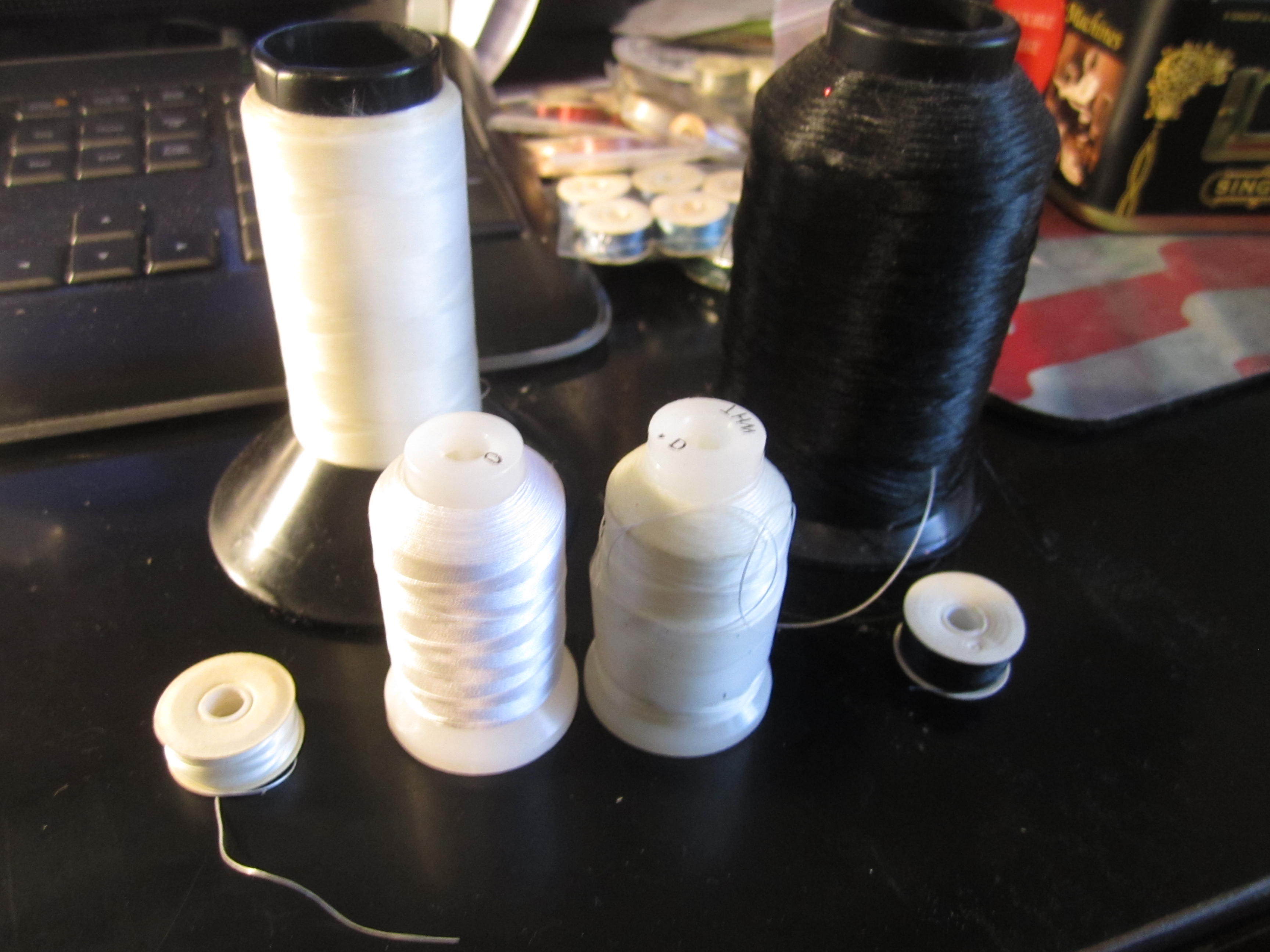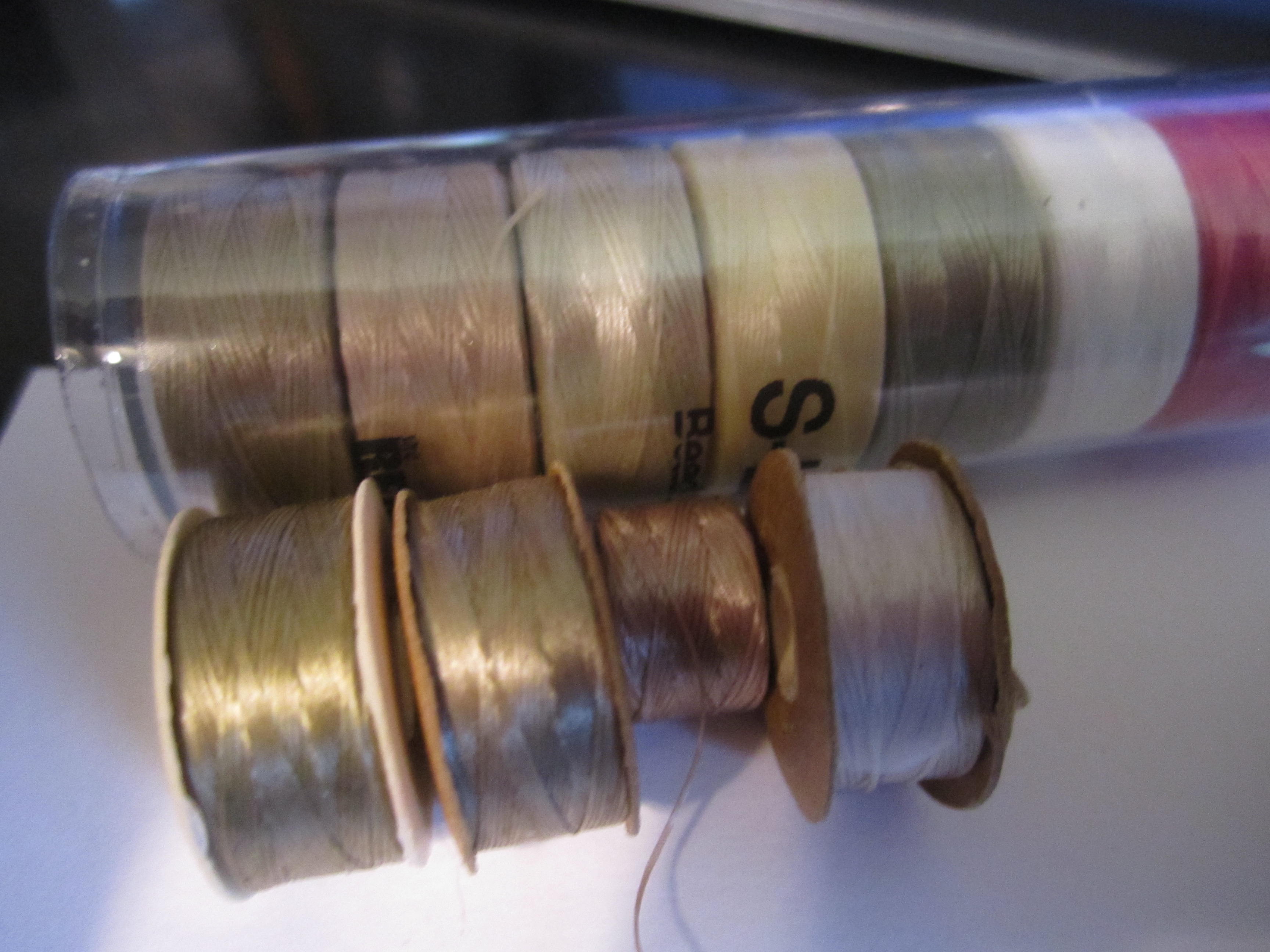 Here are all my threads , a huge collection and I did order a second set of the new tubes so that I have plenty for a long time. I know things can disapear and they will not go bad if I buy them, some of my thread is almost 30 years old, so I figured I would get them while they were a good price, on average , a buck a spool out the door, and at 77 feet are bigger than the , I believe 64 feet spools I was using. The smaller spools on average cost me 1.25 to 1.40 each plus shipping, so this is a really great deal . The big white spool is my oldest one, at least 25 years old. You can see from the much newer black spool how big it was back then. I have a couple of smaller spools and the tiny white and b lack, which are also a lot older too.. I did order a large white spool yesterday. I know I will probably not use it for a while, but they are hard to find and I got the same one I have for a good price. I jumped on it. So, with all these threads, I will not need any, no matter how much I bead for many years to come. Seed beads and sequins, I will always add new colors, need, probably not, but want, I will always want to add new colors. I just ordered a huge order of seed beads, but I am changing over to the TOHO beads, much more uniform that the beads I have that are almost 30 years old. Those work well for beaded ornaments, holding a sequin onto the piece does not require uniform beads, so I will use the more uniform for actual beadwork. Earrings, bracelets and so on. I am very excited to be getting back into my true bead love, working with those wonderful seed beads and my beloved sequins.
