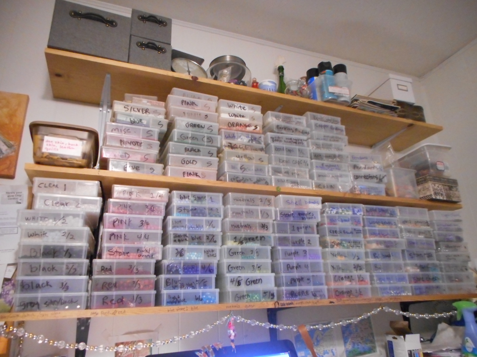 So, here is a shot I just took of my shelf. I am not sure how many beads I have, but it is many thousands,tens of thousands if not millions of them. This is not counting all the seed beads that I have in a photo box the size of a shoe box, just completely full of seed beads, like I said, probably about 8 to 10 boxes worth. Maybe even more….its a lot