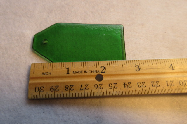 Glass tag. Literally a tag made of glass. Smooth edges and rippled on the bottom, glossy flat on top, this picture shows the bottom. I have them in several sizes, colors and shapes to still list.