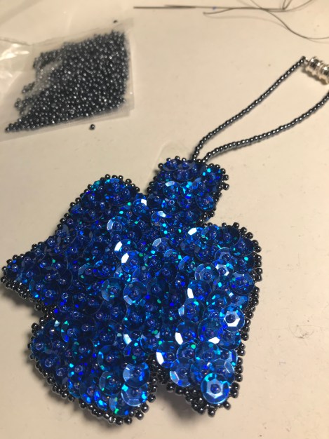 so , unfortunately the colors did not come out even close in the pictures. The sequins were a hologram sequins with both a rich cobalt and an electric blue. I used a hemetite seed bead, color only, glass seed bead, to accent the blue and match his gray interior. It is stunning, but pictures do not even do it a bit of justice !! It has a loop with a magnetic clasp on it to hook on his mirror.