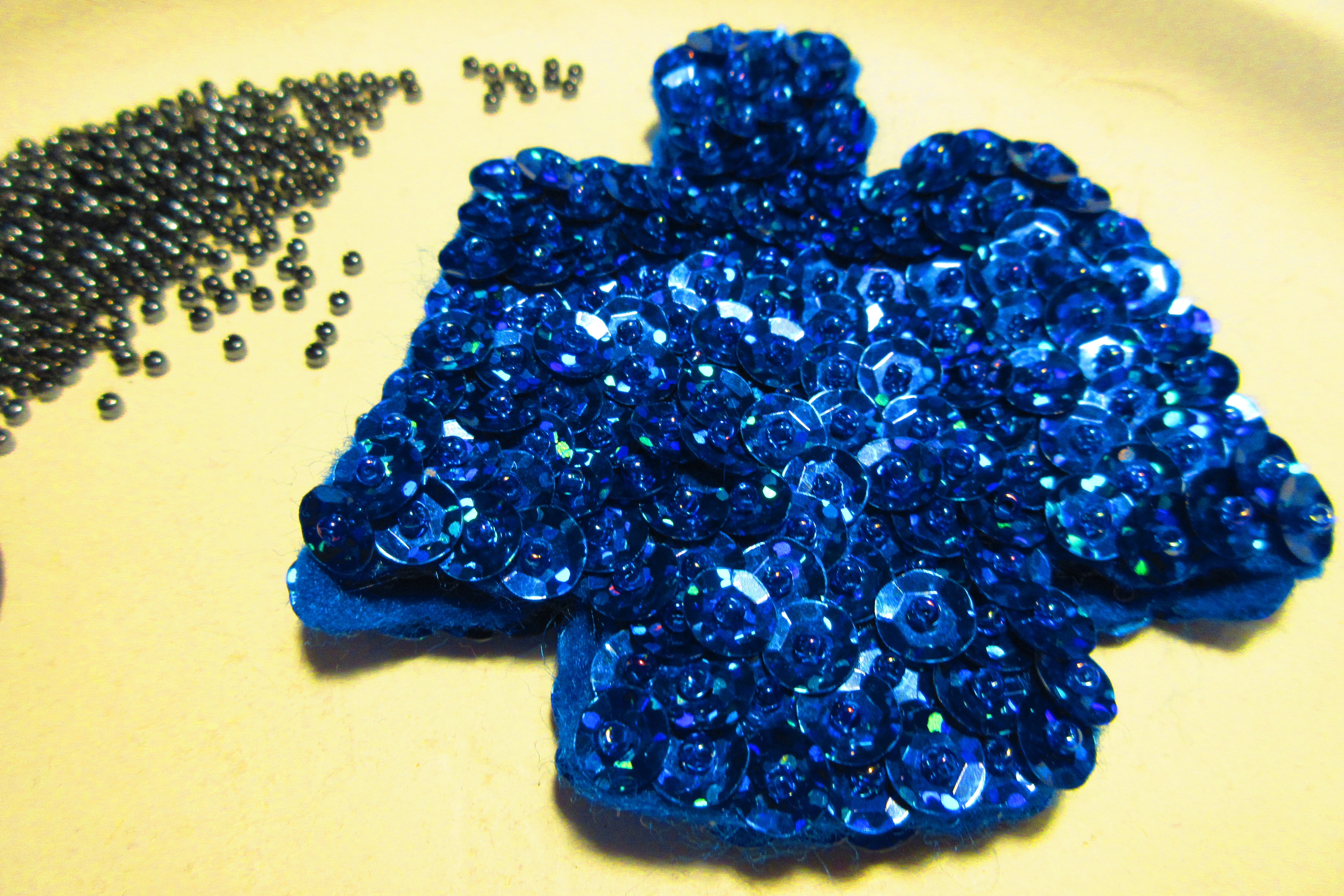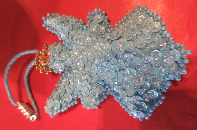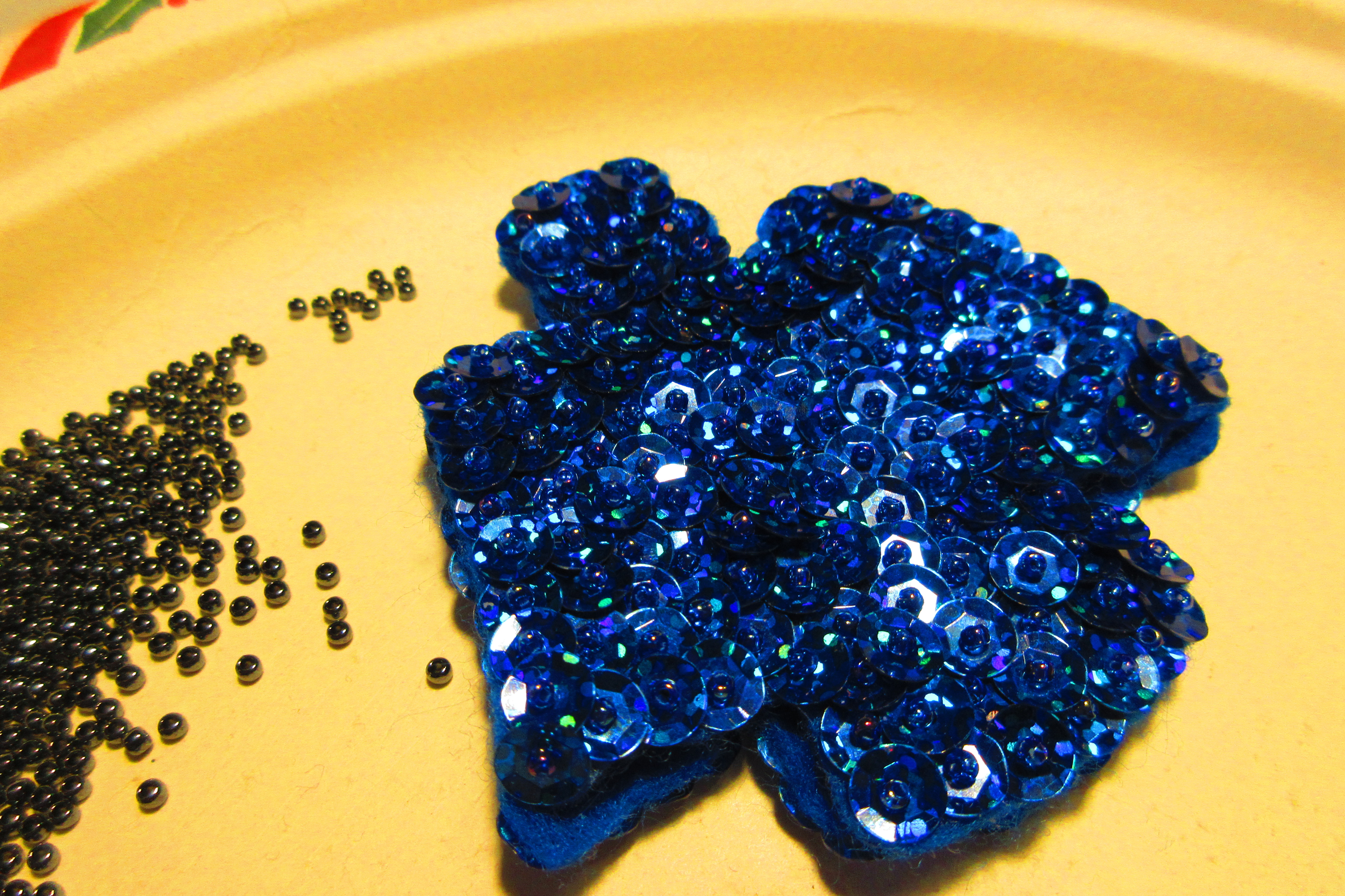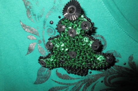 This green and black tree was a pin I did to wear with a shirt you can see behind it that had a beautiful black pattern on a green shirt.The picture makes it look faded, it was not !! I love this pin and had a lot of fun using a rich green sequin and fun shaped black sequins. I am thrilled with how it came out !!! I plan to make a black and red heart for Valentines day to wear with the red shirt I have just like it !!