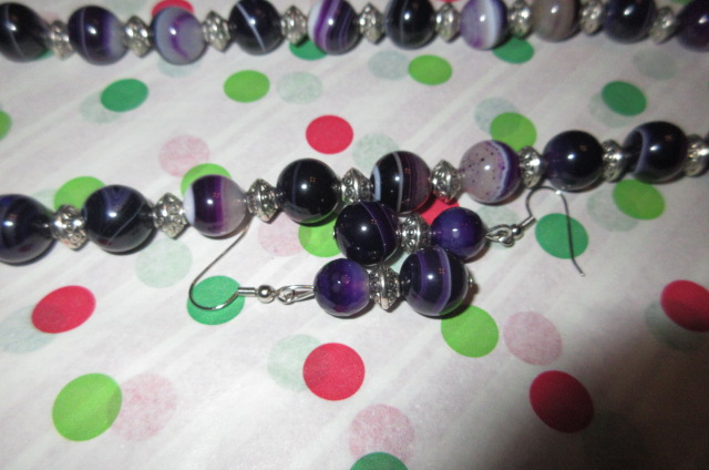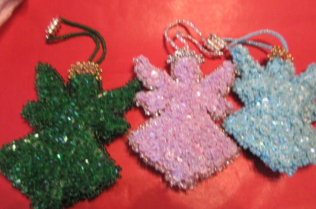 The four angels at the top , blue, green and lavender, were gifts for my mother in law who wanted them to hang around her house. It took me way too long to do them as I was in that funk all year, but I got them done along with a pretty purple beaded necklace and earring set also pictured here !!