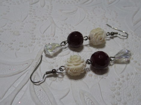 I love the white beads in the next set of earrings. Big regret when I found a string , actually circle, of these interesting beads, I only bought one of the two. They look like bone, but not sure what they are. Very pretty and could be older. I used a deep raspberry red stone and a clear glass drop for these beauties.