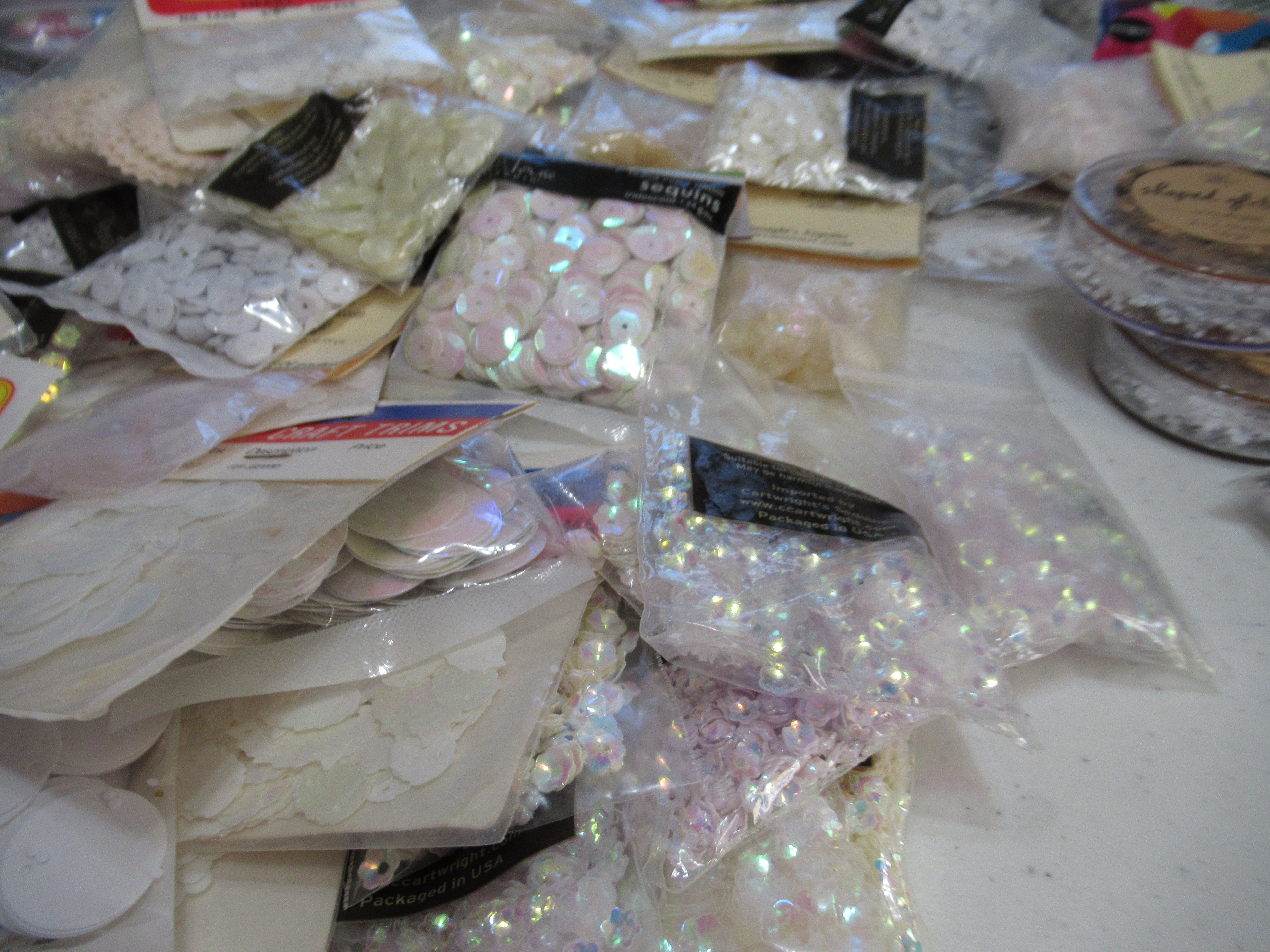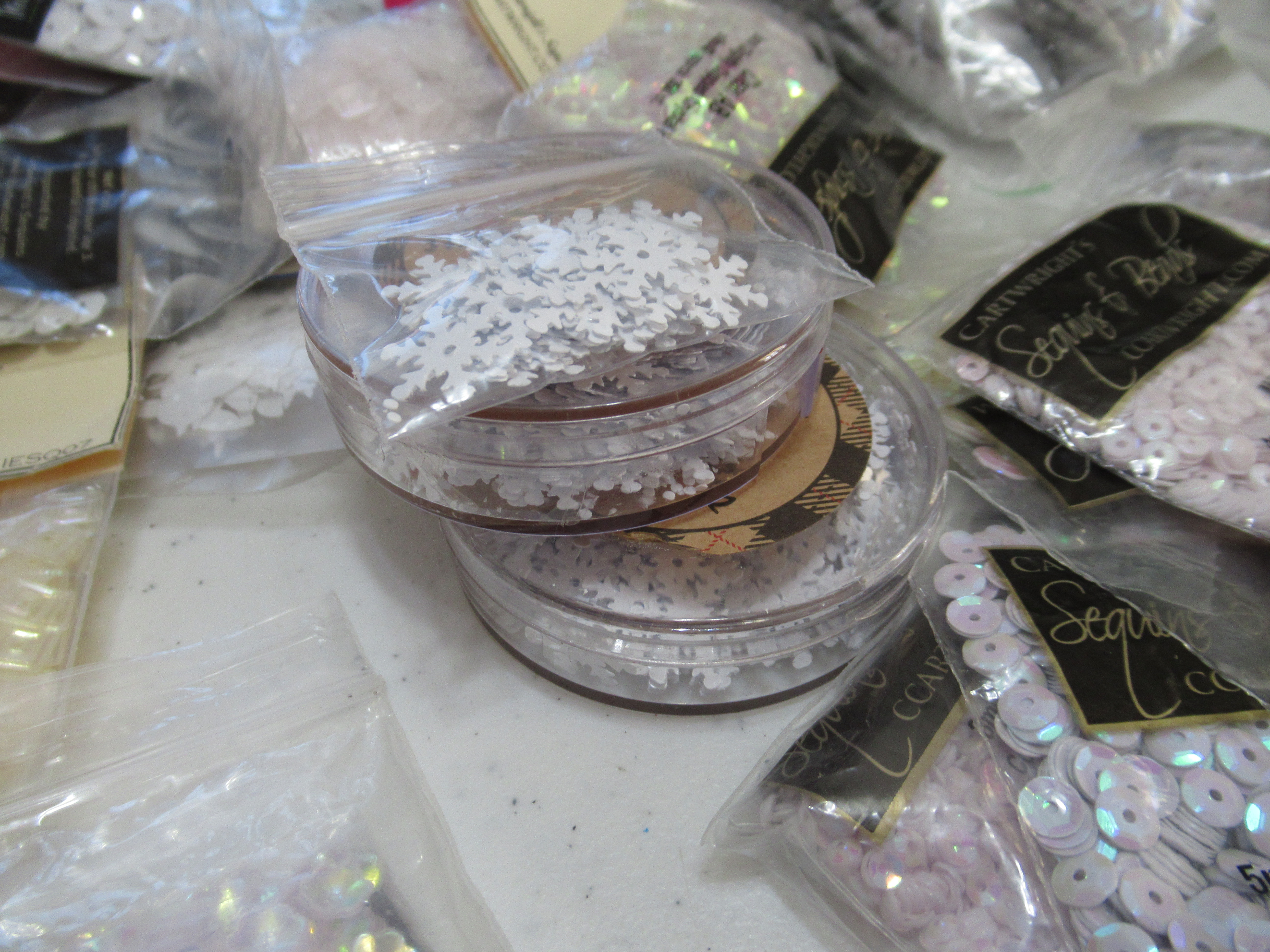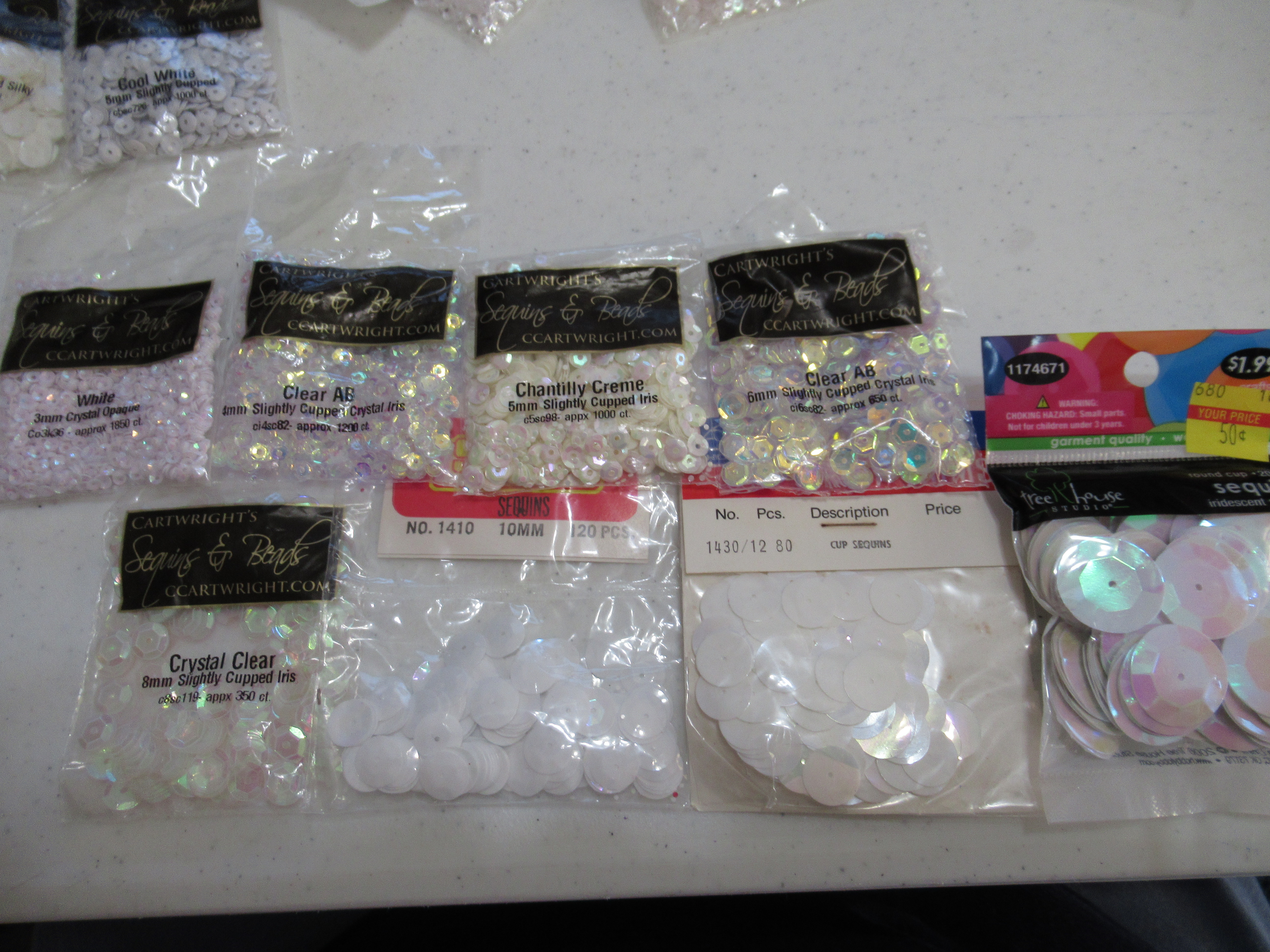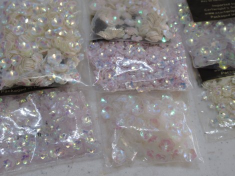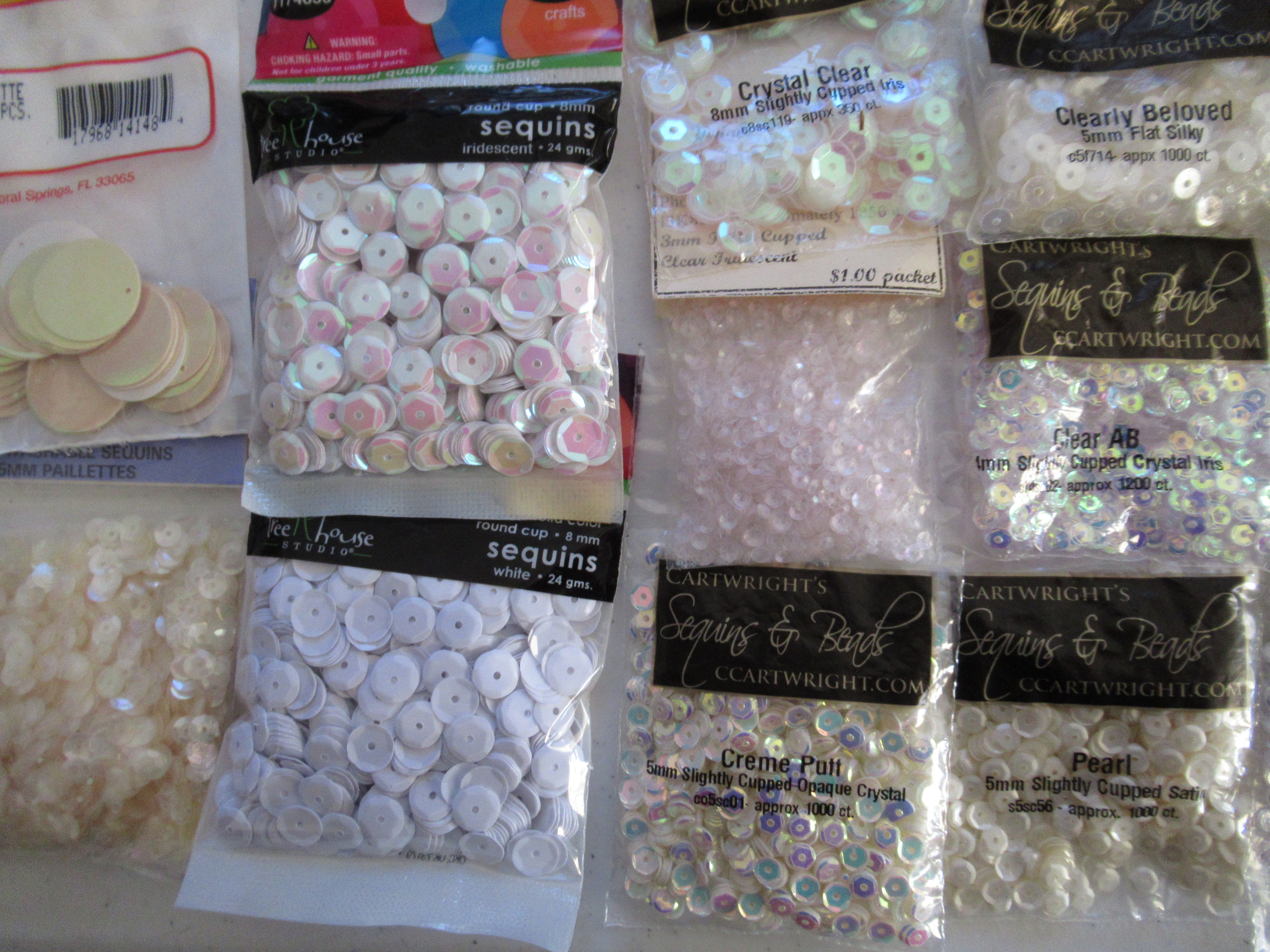 So, lets get started. Some of my sequins were purchases from Hobby Lobby, some are from a vintage haul of over 2000 bags I got a couple of years ago ,but most, I will admit, and you can see, are from Cartwrights. I showed many from the back, so you can see the contents better, but when needing to show the size, I tried to show good pictures of the front. These are all shades of white and clear. Just a small amount of all my personal collection, let alone what I have collected to sell. Take a breath, it is a lot, one of my bigger bags , a lot of white and clear choices, which is fascinating to me.