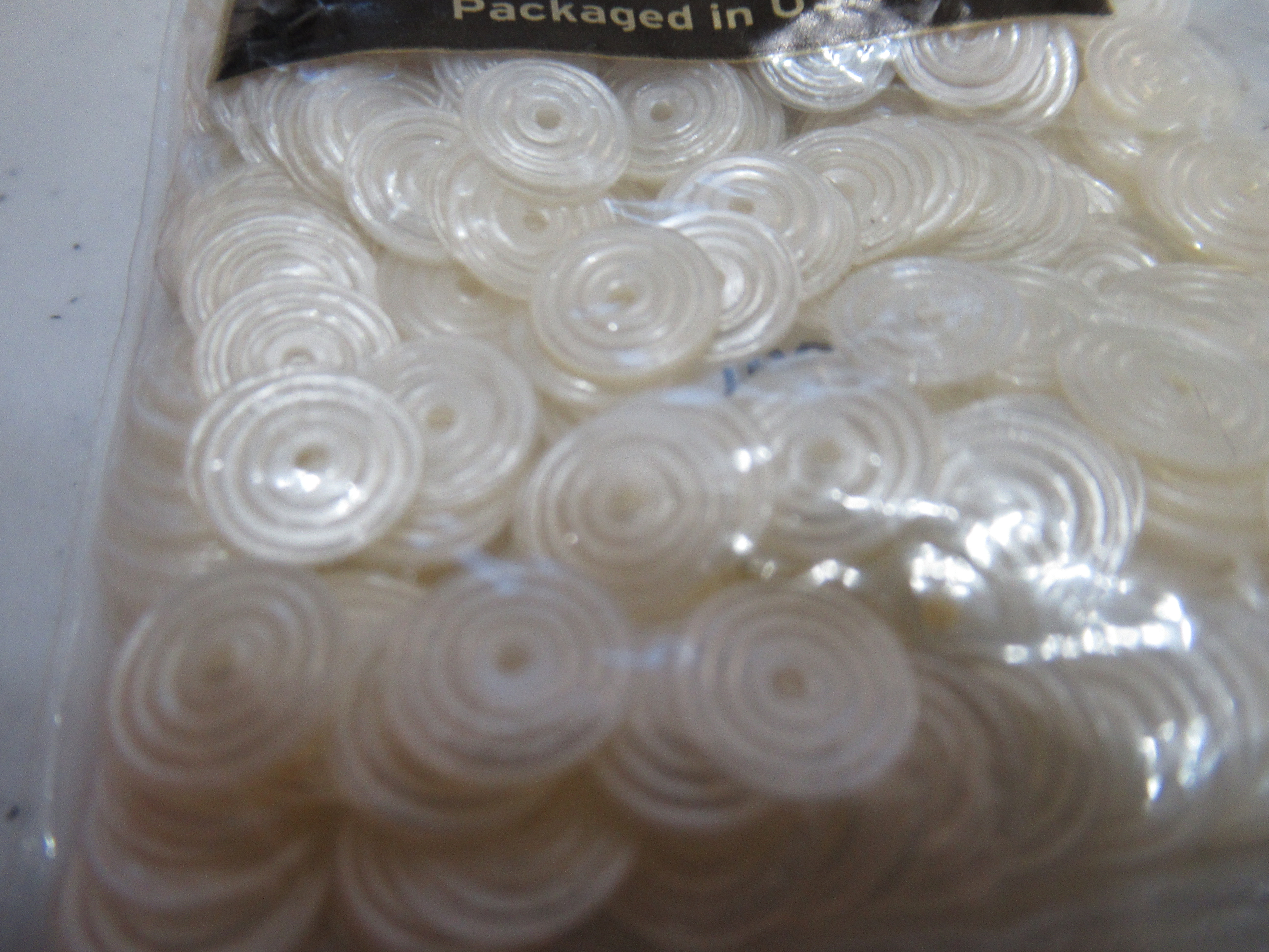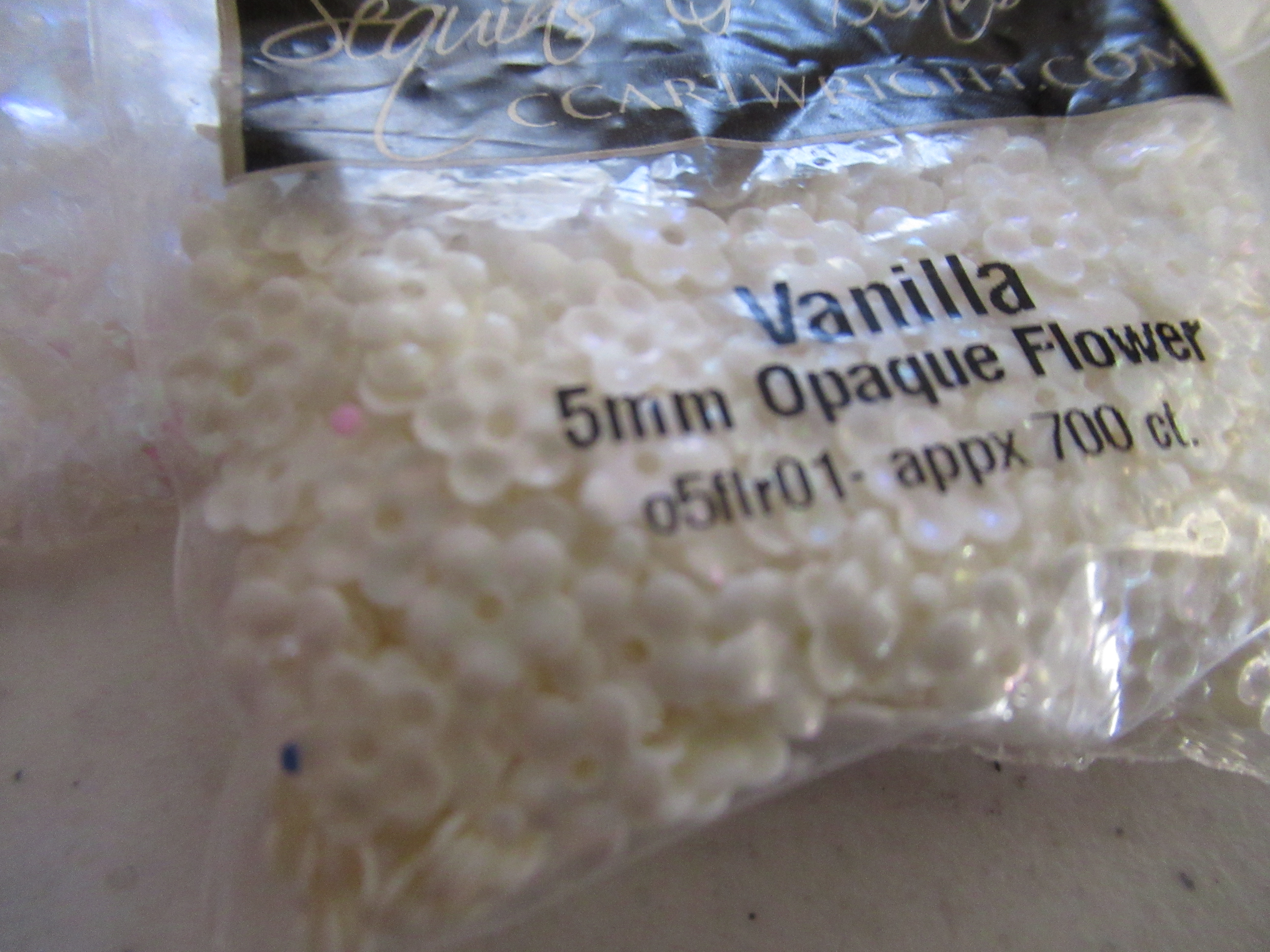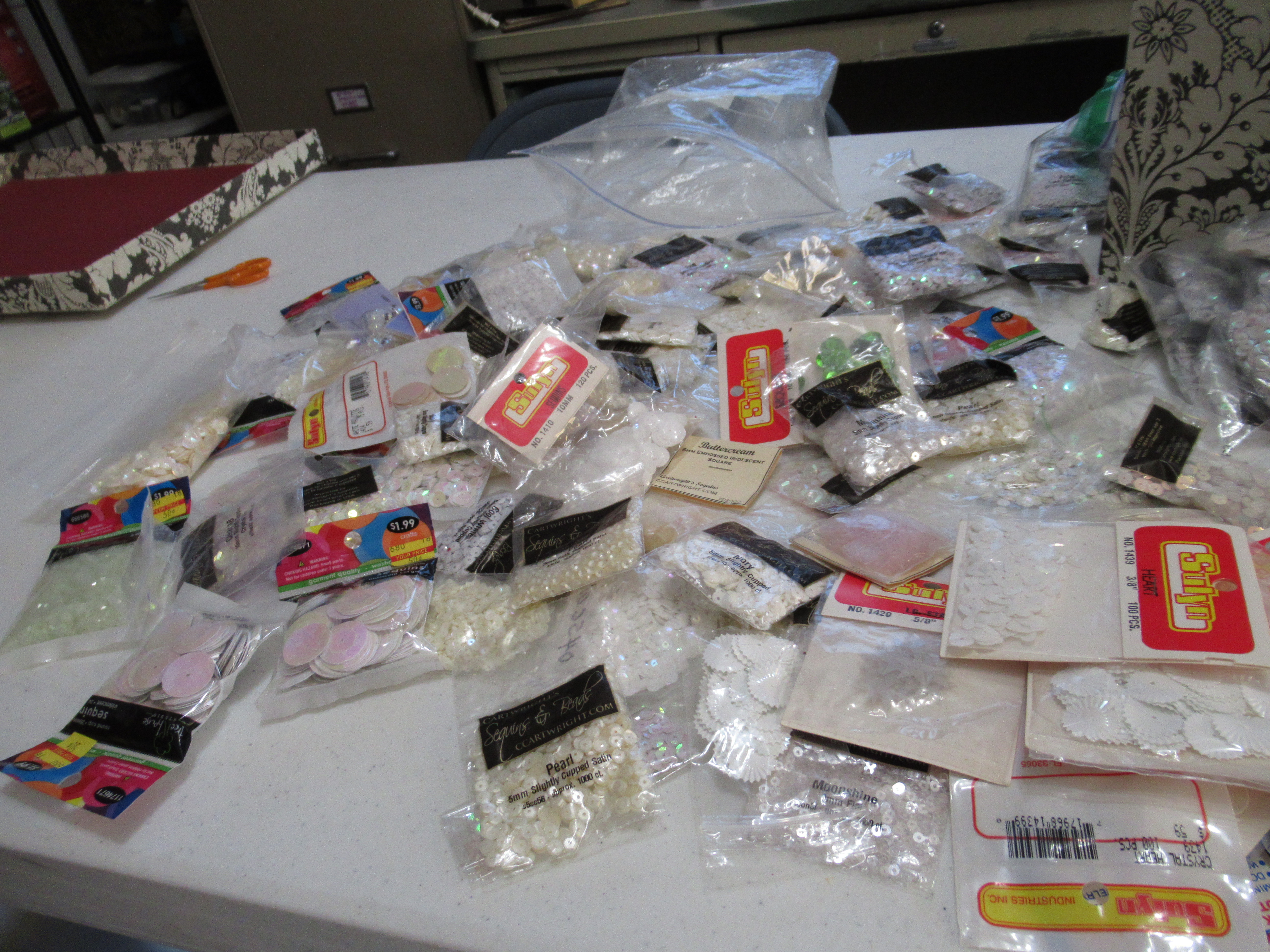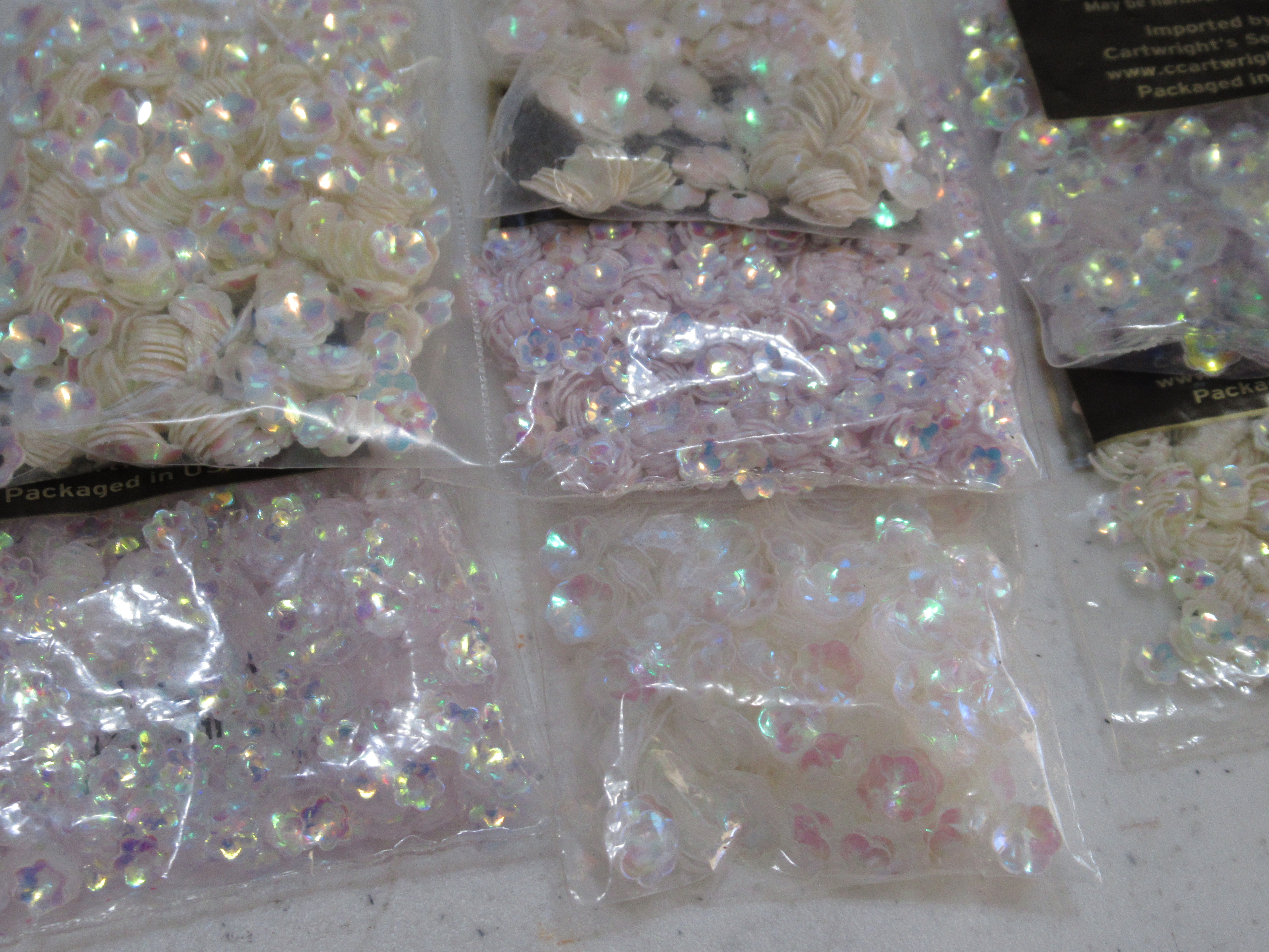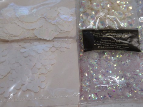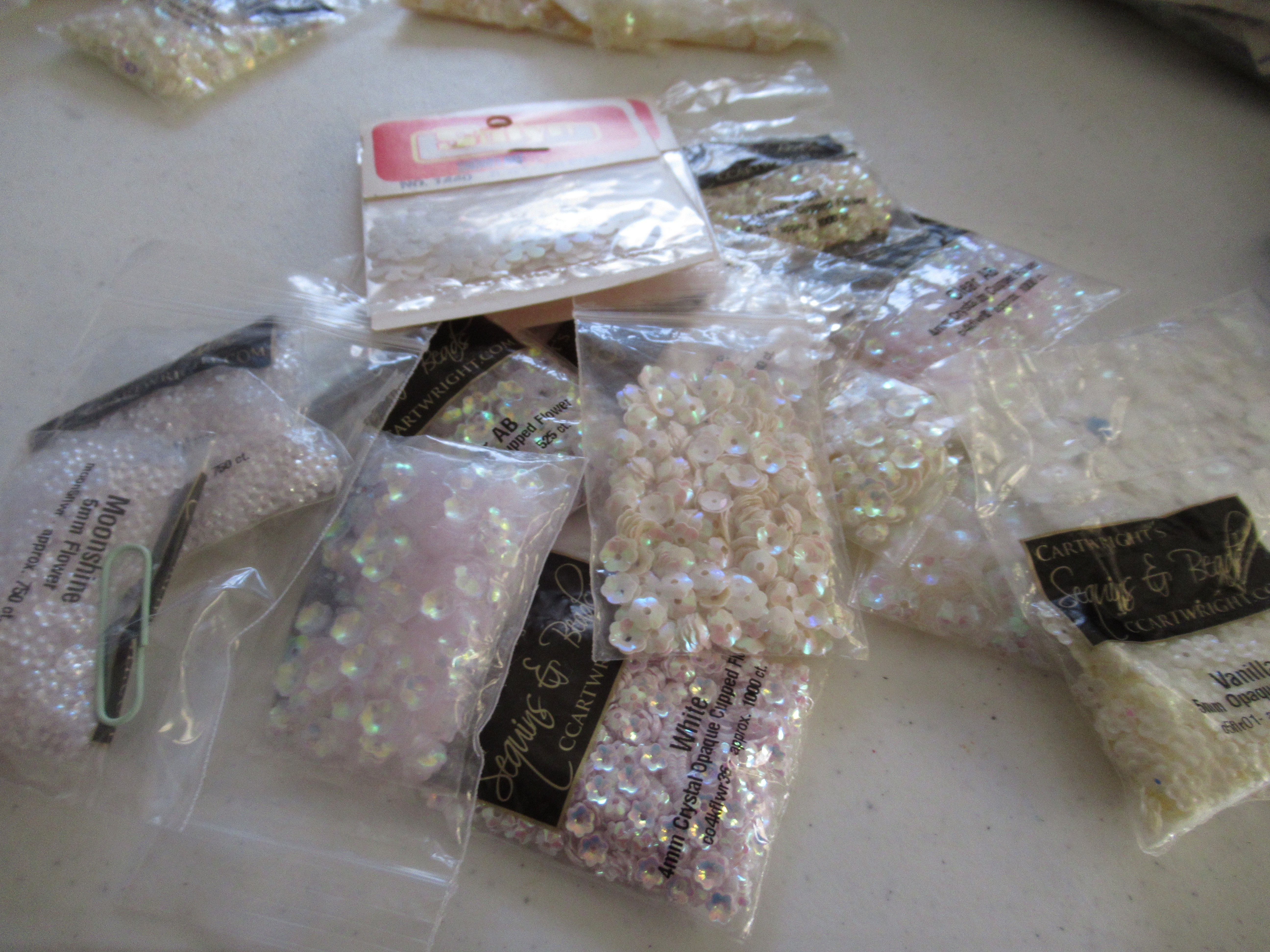So, lets get started. Some of my sequins were purchases from Hobby Lobby, some are from a vintage haul of over 2000 bags I got a couple of years ago ,but most, I will admit, and you can see, are from Cartwrights. I showed many from the back, so you can see the contents better, but when needing to show the size, I tried to show good pictures of the front. These are all shades of white and clear. Just a small amount of all my personal collection, let alone what I have collected to sell. Take a breath, it is a lot, one of my bigger bags , a lot of white and clear choices, which is fascinating to me.