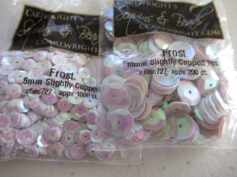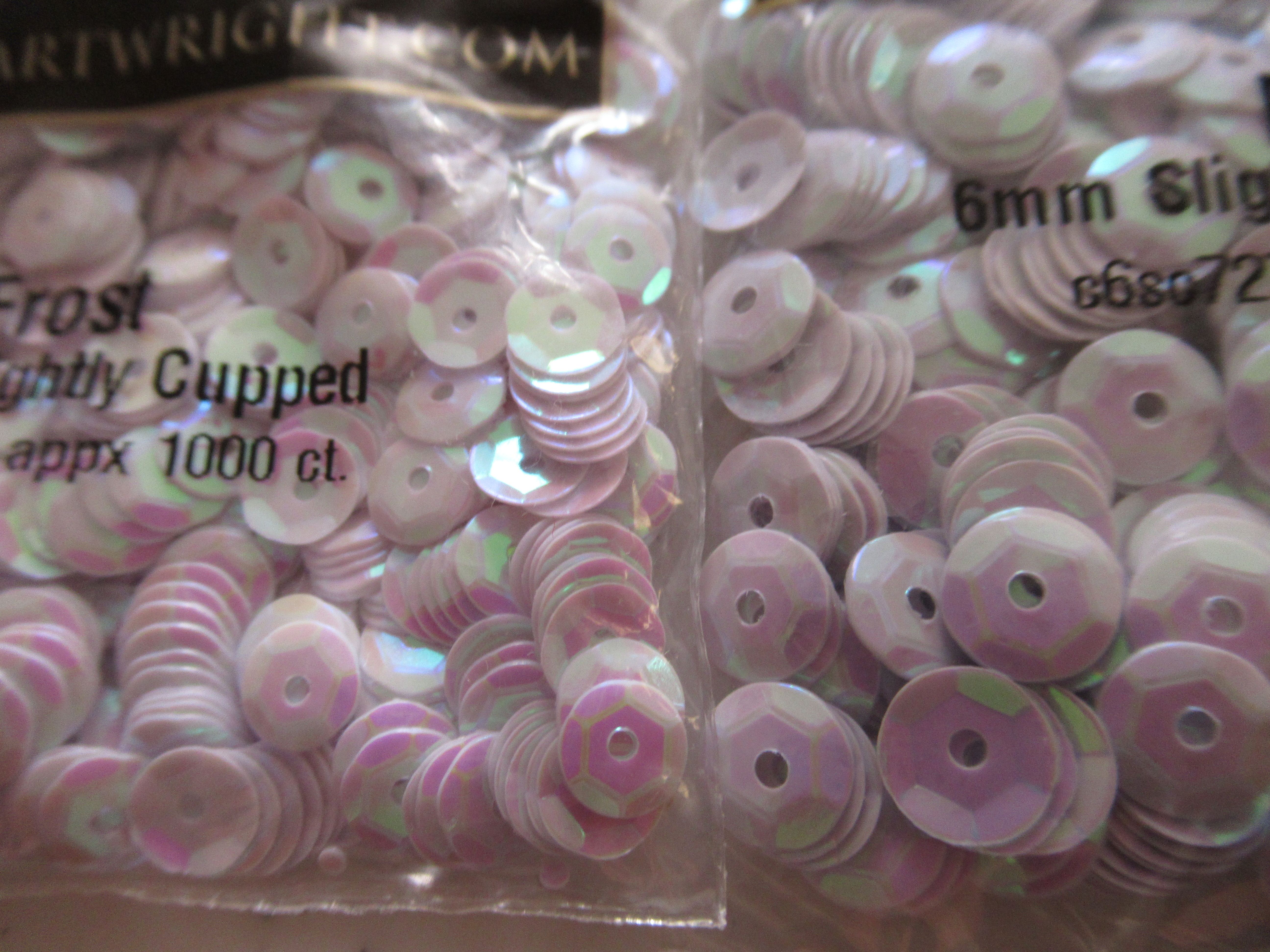 the two sizes I use the most are 5mm and 6 mm. I love the weight and look of the size 6 much more than the five. But the five is a smaller size and sometimes more convenient to use on smaller items. This is the same exact sequin in the two sizes. You can see just changing the size makes it look like a slightly different sequin. Frost is the color of both but the small look brighter and have a more pink glow, where the larger have a darker look. Could be lot changes too, not sure how that works with sequins, but found that interesting.
