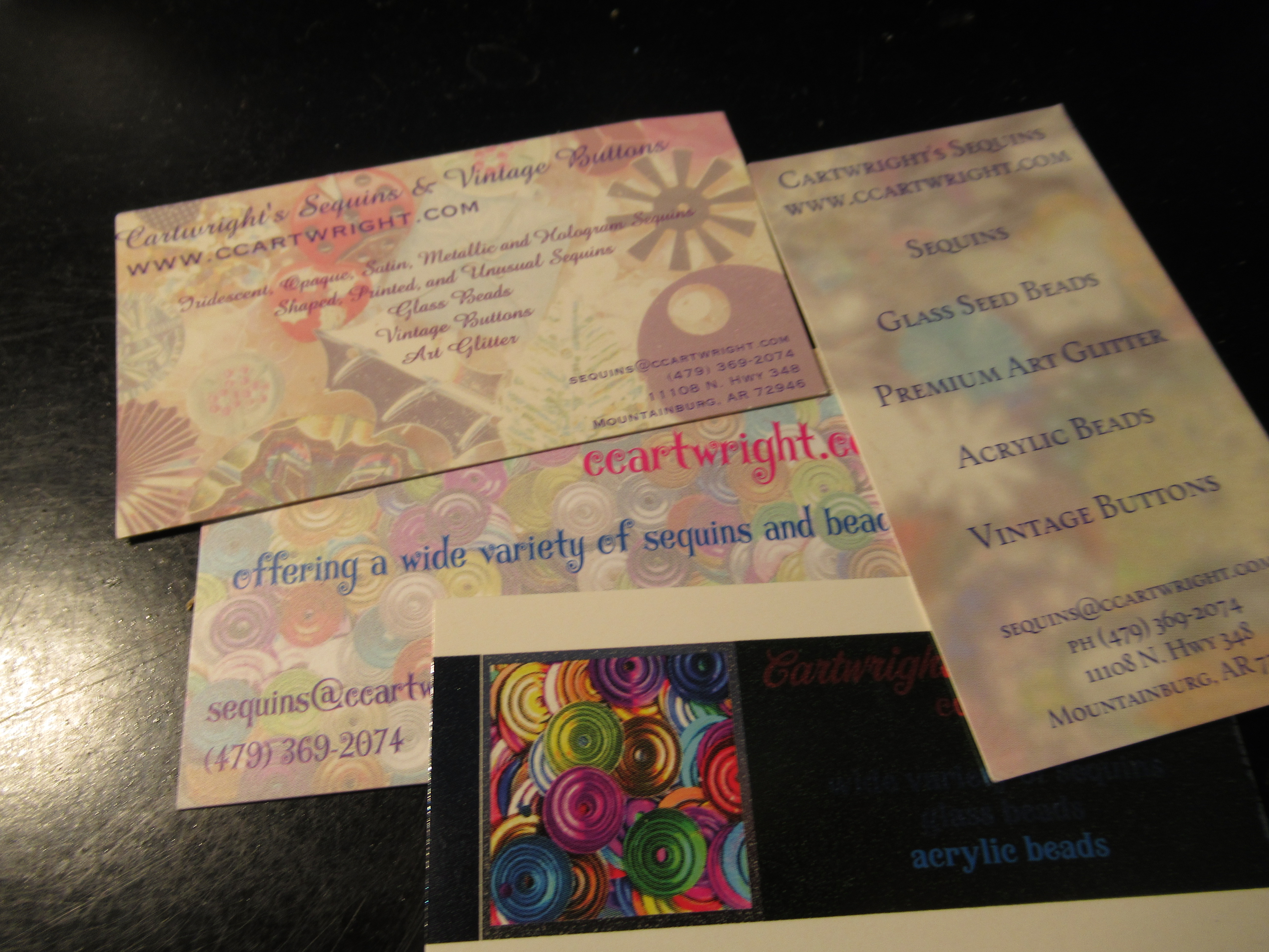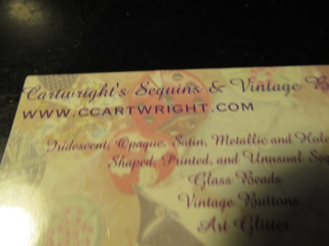 I buy most of my sequins from an online store I found over ten years ago. When I first started buying from them the sequins were hand packed and had stapled on labels. Now , all these years later, they have so many more to choose from and they are professionally packaged in little sealed bags. I get no kick back from them. Other than being a customer, they do not know I exist. However, I love to tell people where they can get great things, and if you , like me, adore sequins, this is the store for you. I keep cards from the companies that send them and over the years their card has changed a lot. Here are a few of the ones I kept. I just put in a small order, for me, just under 20 bucks, I have spent over 100 more than once over the years, but my average order is around 20 to 40, especially when they have a good clearance sale. I wish I had signed up as a member from day one, I really did not pay attention, and only the last couple years , some of my orders are on there. It would have been nice to have them all lined up, but I still have a few years of my receipts, so I could dig them up. I have spent a lot there, but sequins are something I just love and plan to get back to creating with them again. So, when you type in the name, there are two c’s at the start of their name. I hope you will check them out, prices are great, they will let you send some old sequins in and see if they can match them of you have a repair project, they ship fast and I believe the prices are excellent, and the shipping price is fair. They do sell some other things as well, seed beads, which I have bought from them, some glitter, and I think they still sell buttons, but I am not sure. They also cater to people into pocket letters, and I know a lot of you tube folks who do pocket letters show Cartwright hauls. If you go to youtube and put in Cartwrights you will probably find a lot of haul videos which are fun and show you a lot of their pretty things !!!