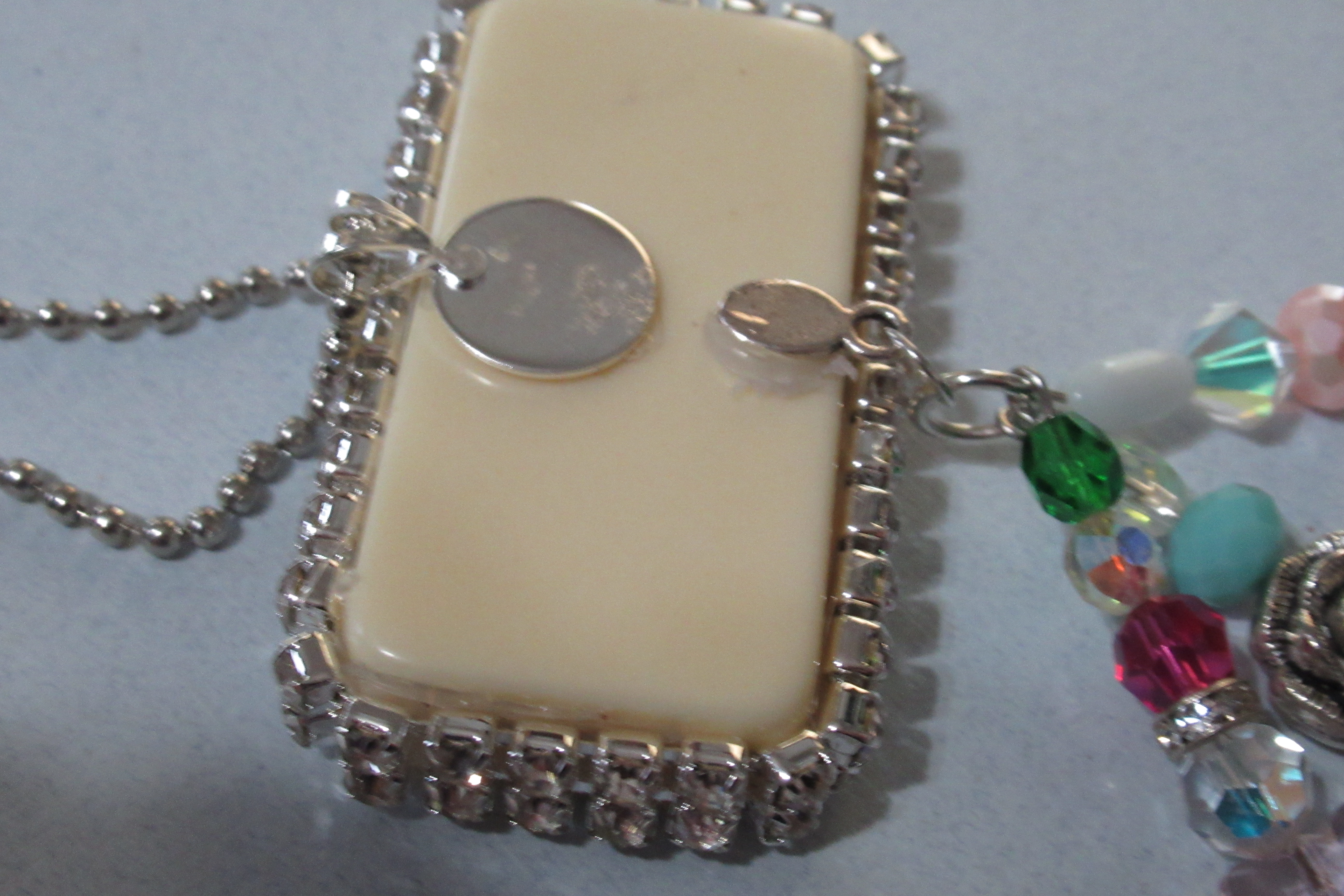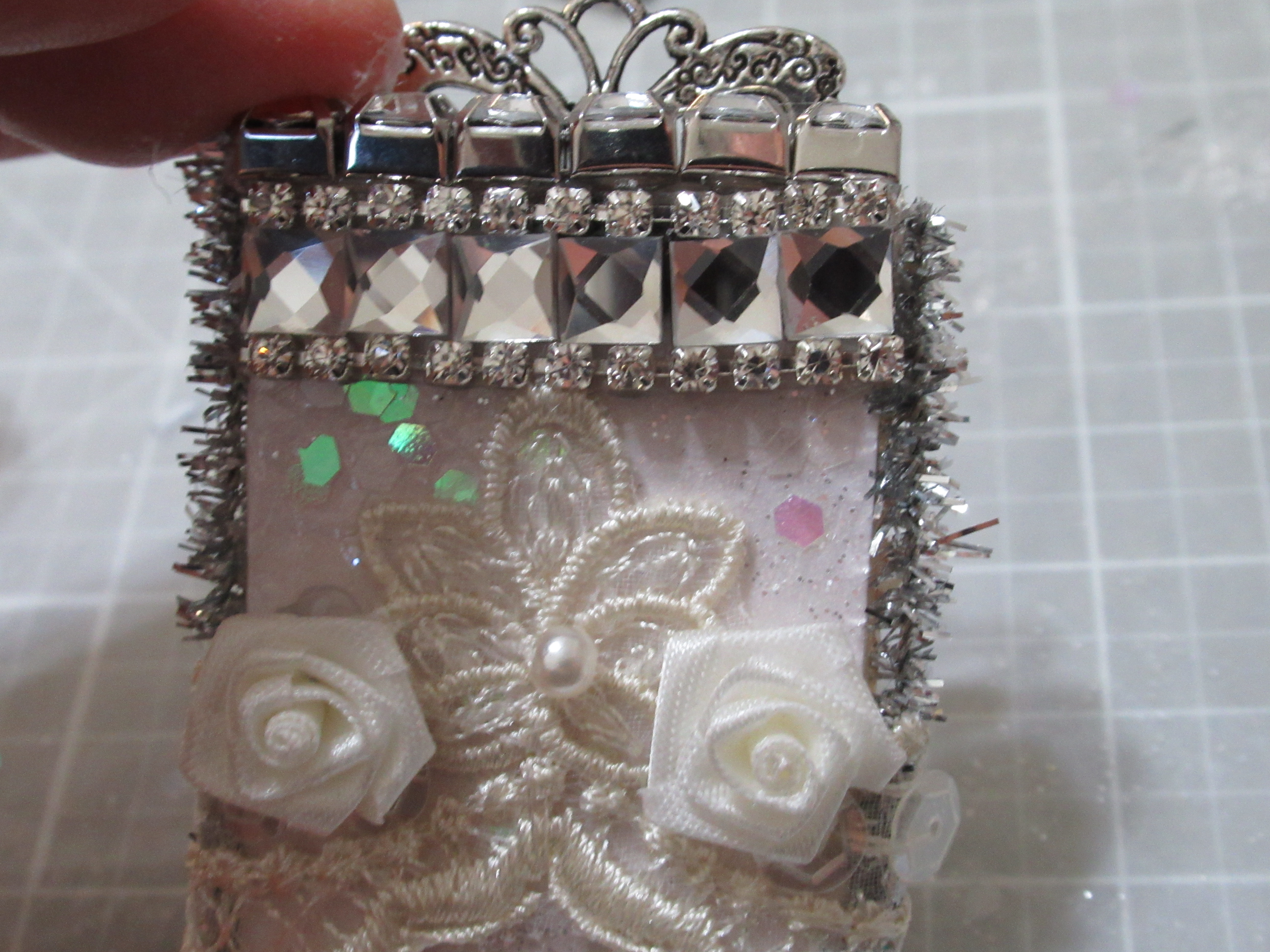 third one is the first one I made with a big vintage white domino . I used a double rhinestone close chain for the edge of this piece and used triple thick to add dimension and lot of different glitters on it. I was very pleased with out it came out. I used E6000 to glue on any findings on these items.