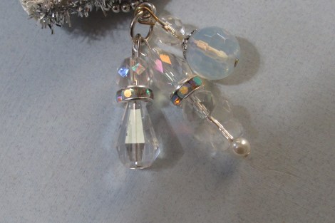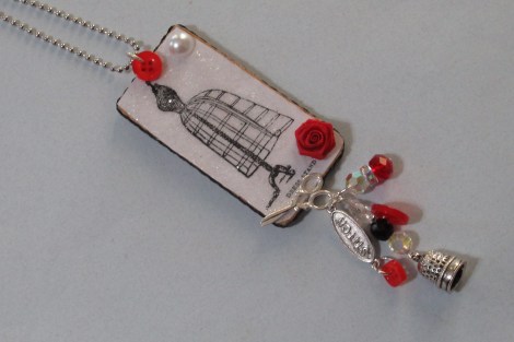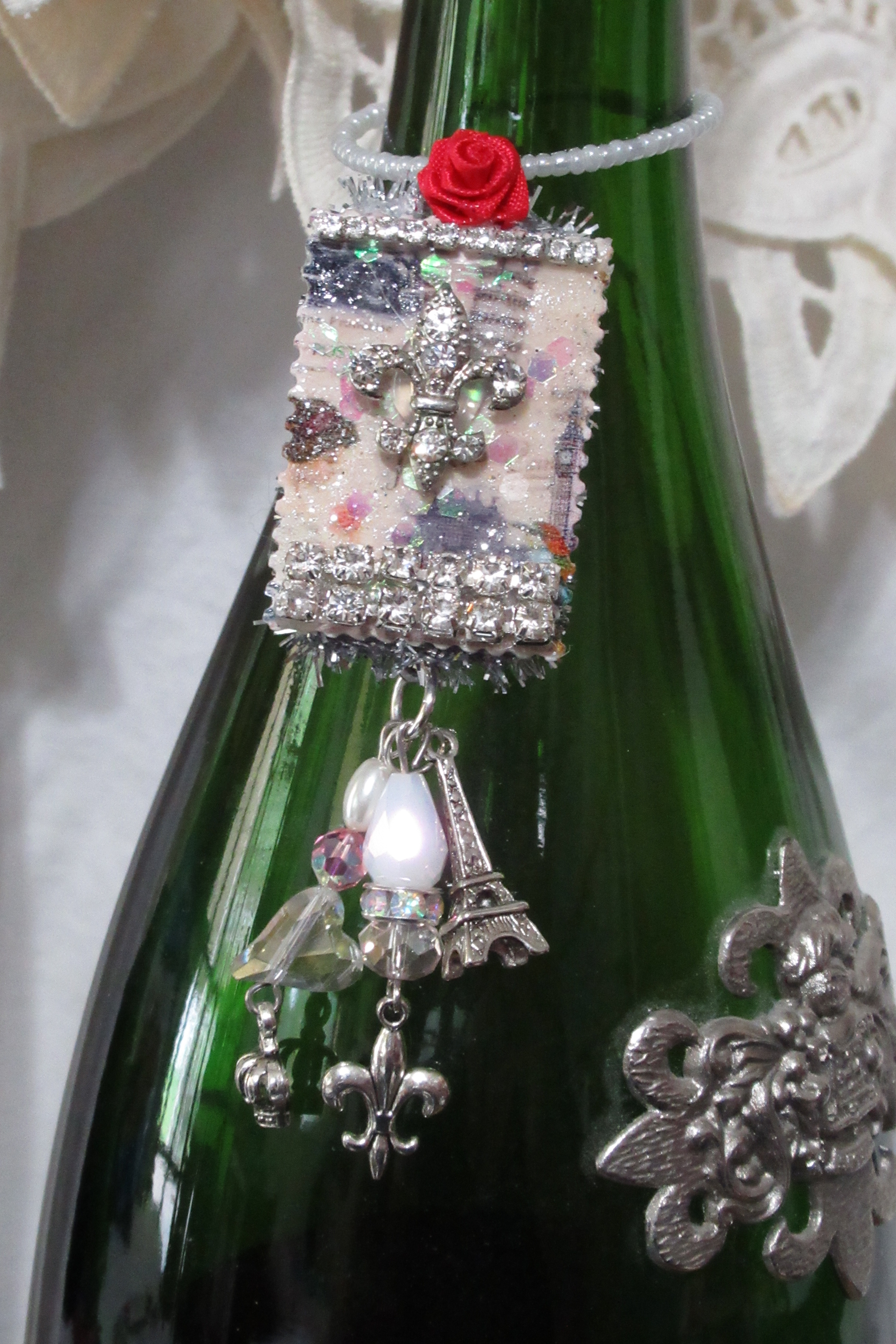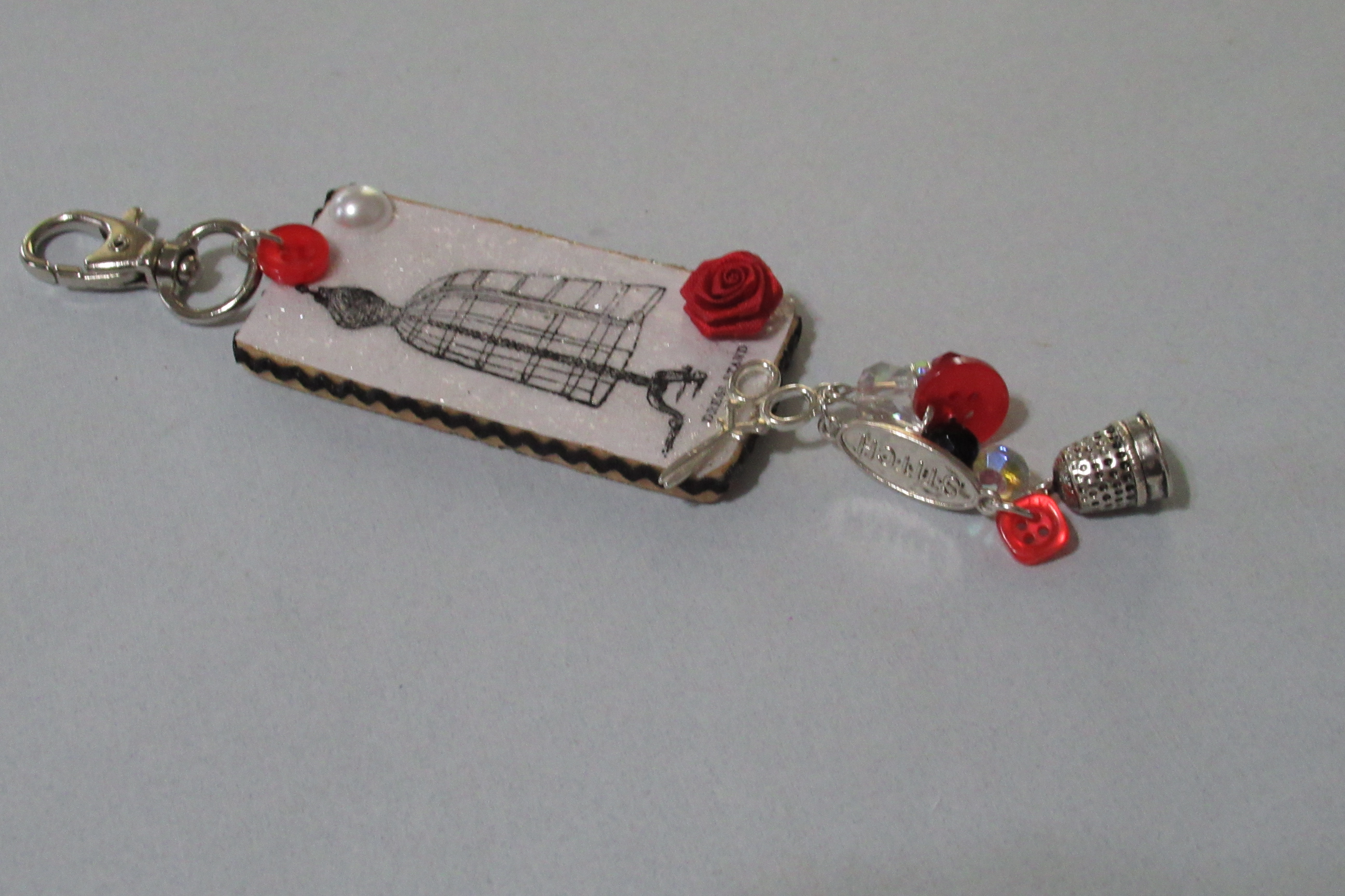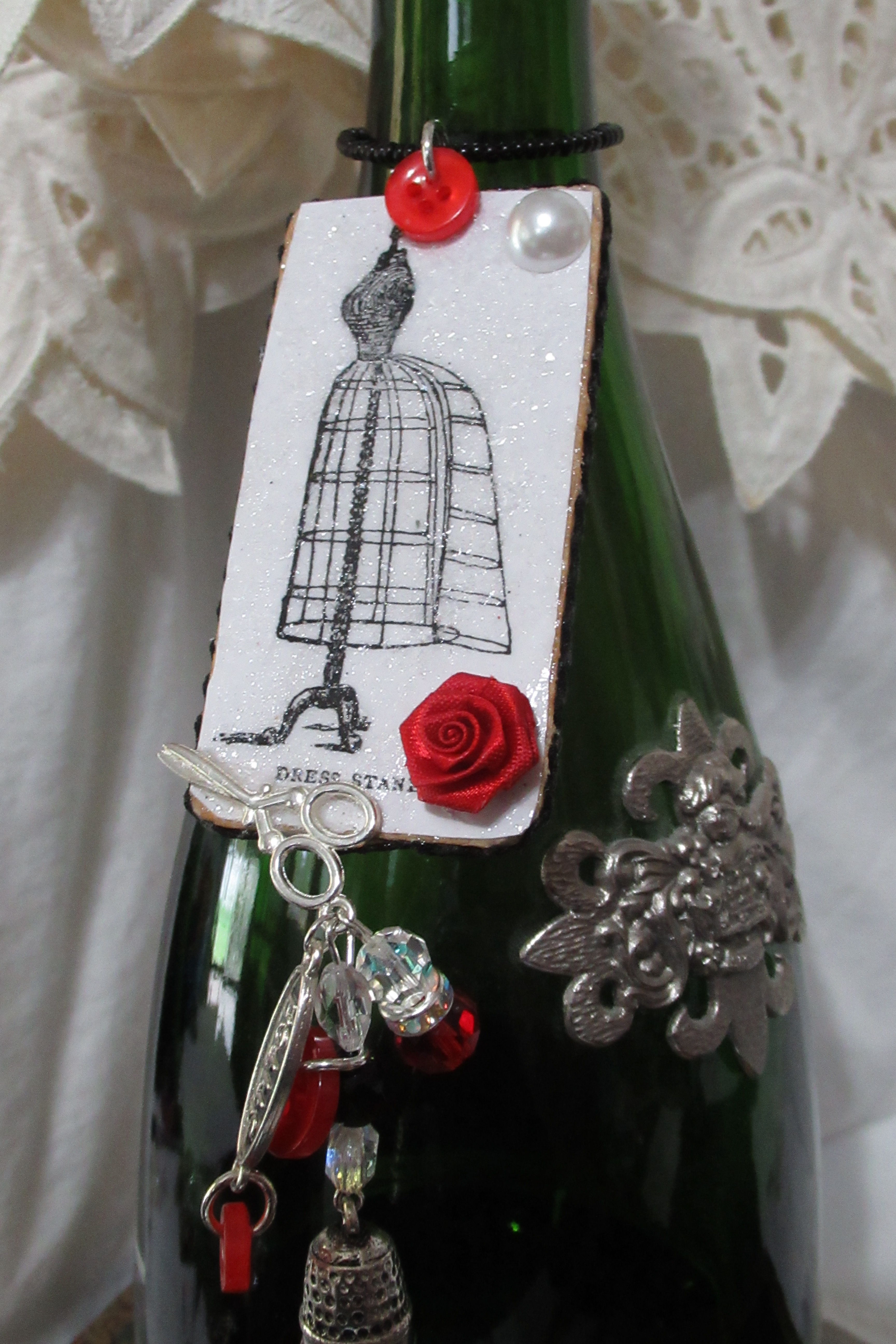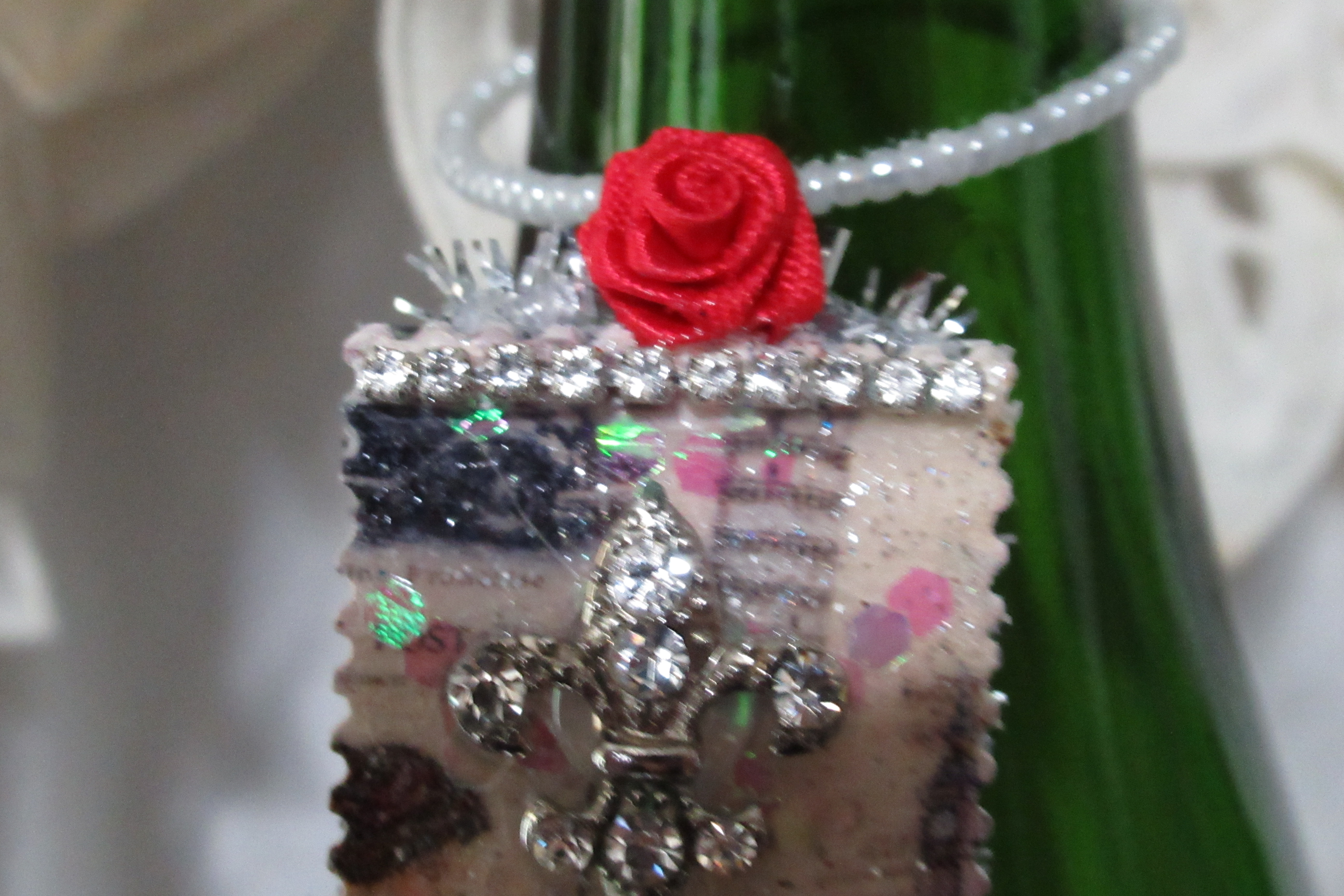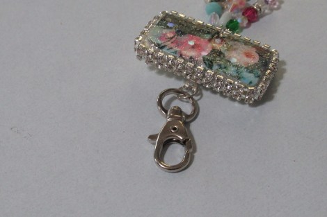 My fourth one is a tiny wood domino with a decorative wood button glued to the front of it and decorated with the Triple Thick, which is kind of like modge podge with a really nice clear glass look. Lots of rhinestone bling , plenty of charms and glass beads
