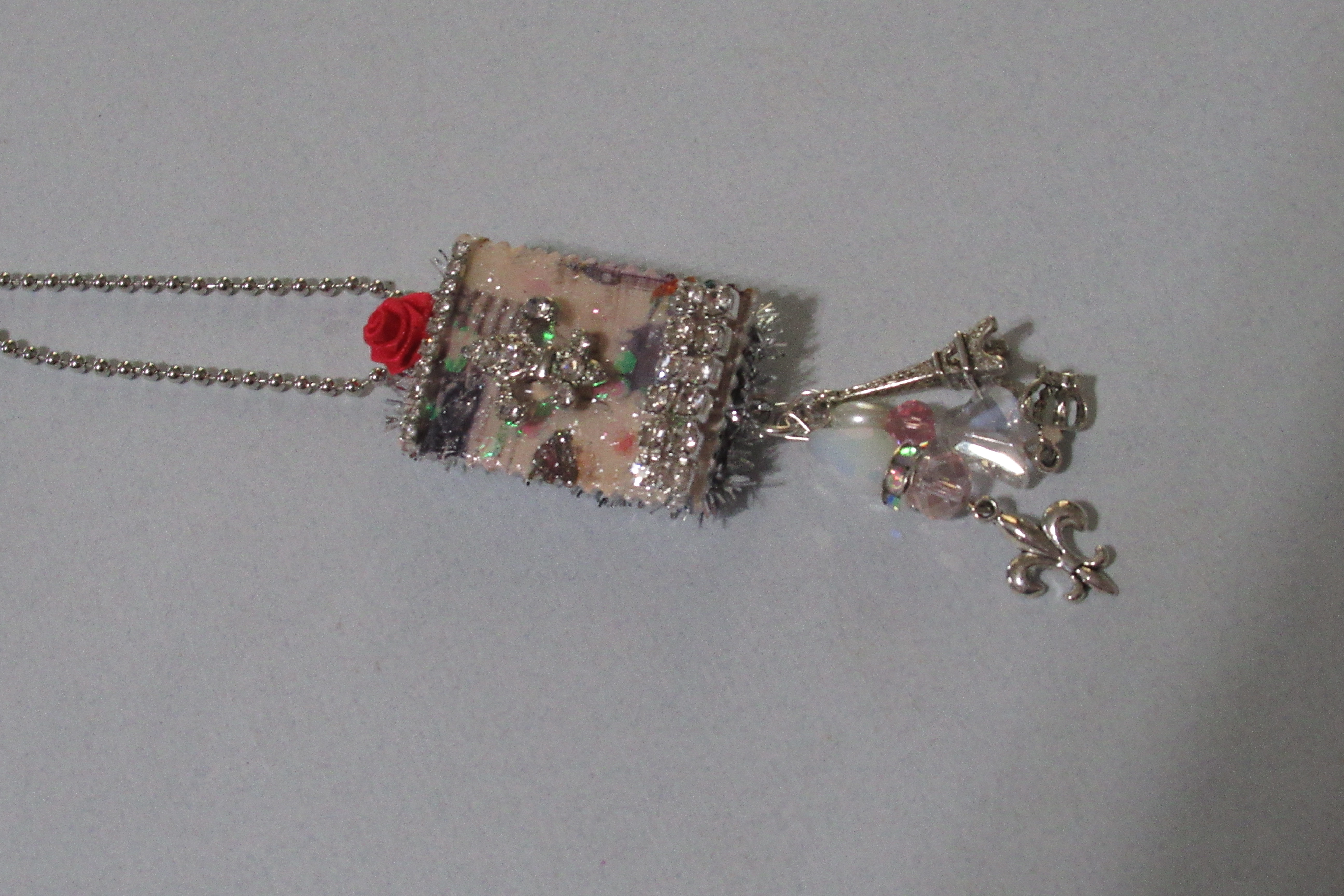 These are a decoupage type of project using craft paper or printed pictures, decoupage glue, glitter, charms ,glue on bails, dominos, wood scraps, and so on.
