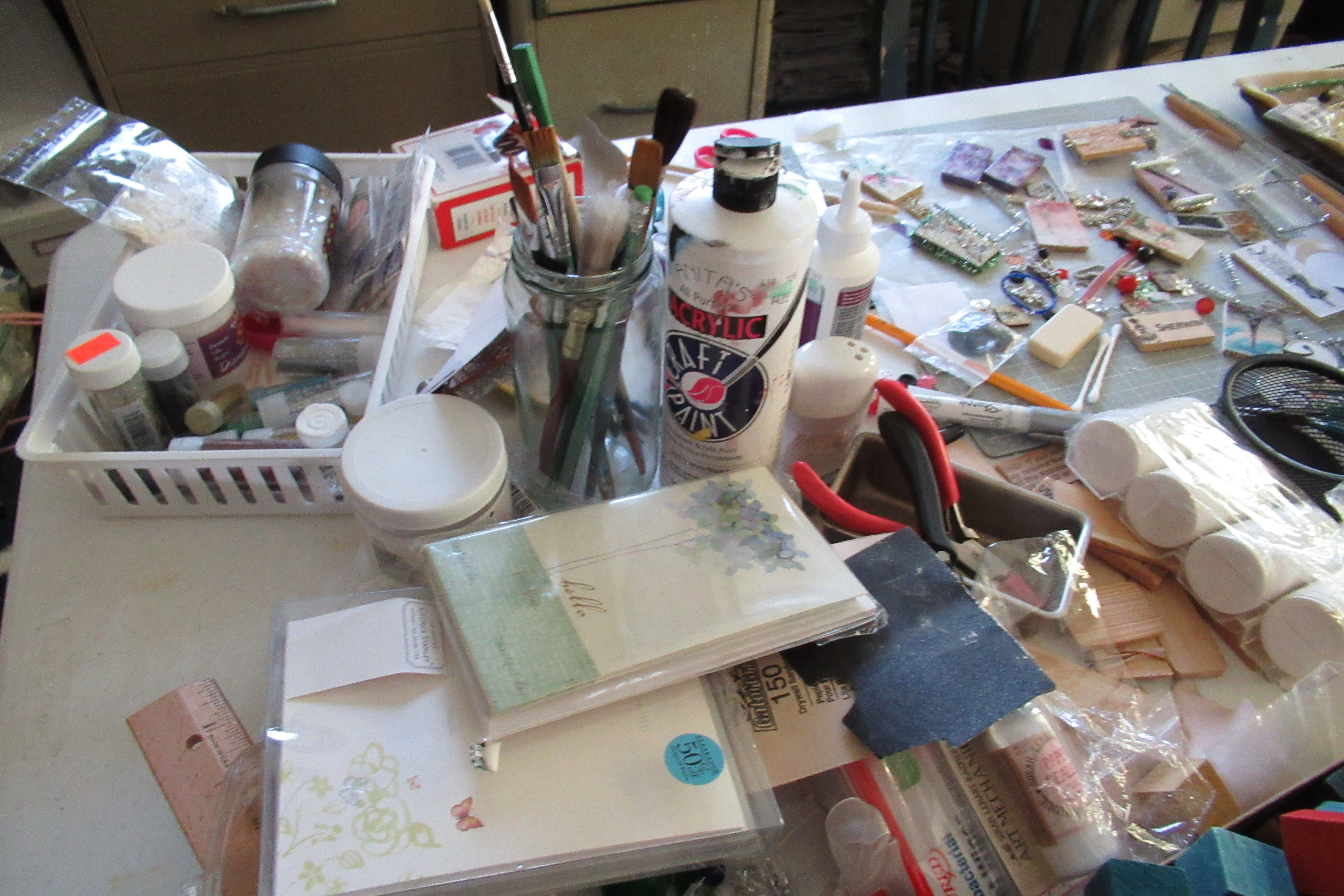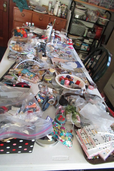 I am not sure if anyone else has this problem, but I am pretty sure other creative people do. I tend to want to do, or at least try so many things, and I end up not doing much of anything at all !! I have so many unfinished projects on my table and I am have so much trouble staying focused. Below are pictures of my six foot long table, COVERED in wonderful things !!
