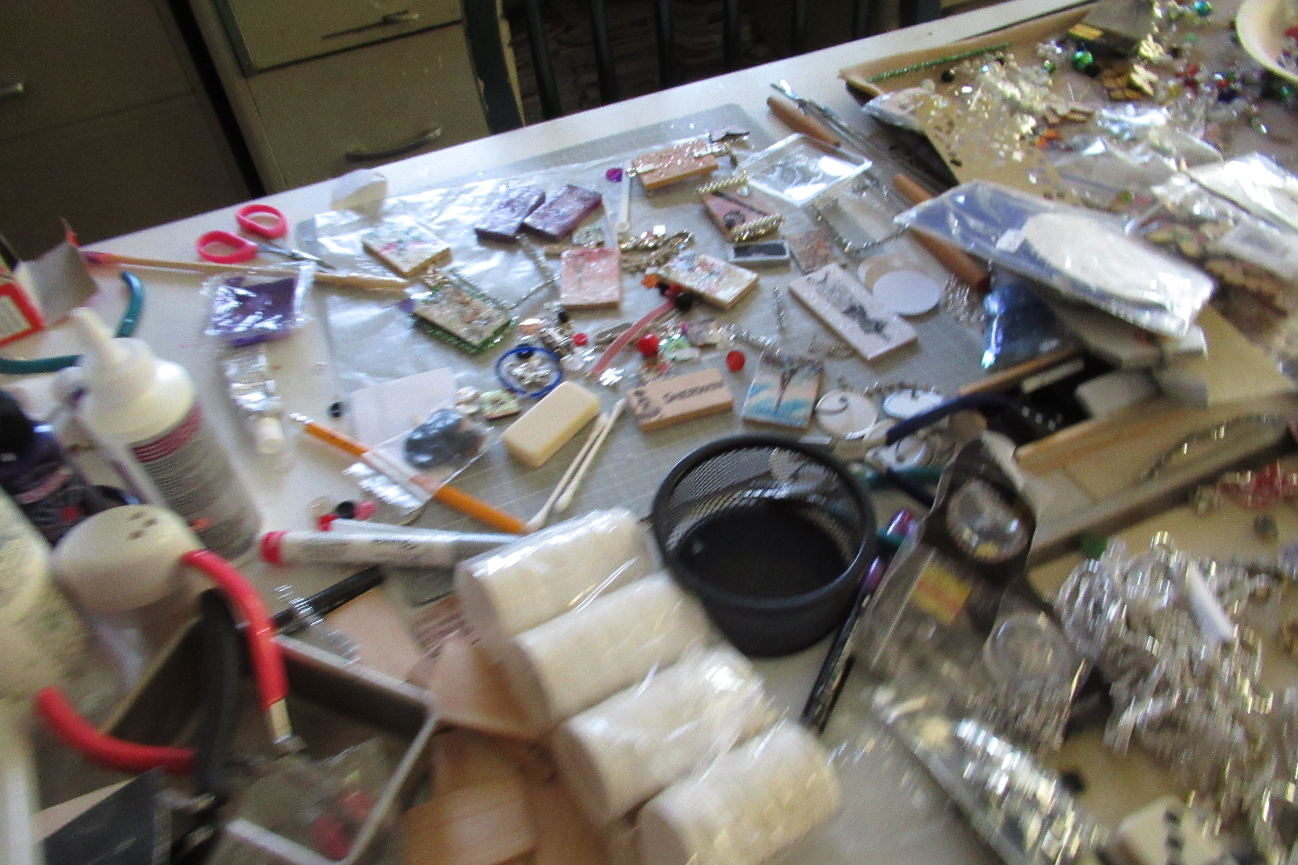 On my table are glitter, including German glass glitter, charms, rhinestones in every shape and size, wooden buttons with lovely designs on them. I got most of my new ideas from a wonderful you tube creator who also has a you facebook page as well. One Very Happy Bird is her you tube channel. Her you tube page is Happy Birds glitter nest and I have never met more wonderful people online. So much support and love , just a great group of people. If you are a creative person who wants ideas, Happy Bird is the one for you.