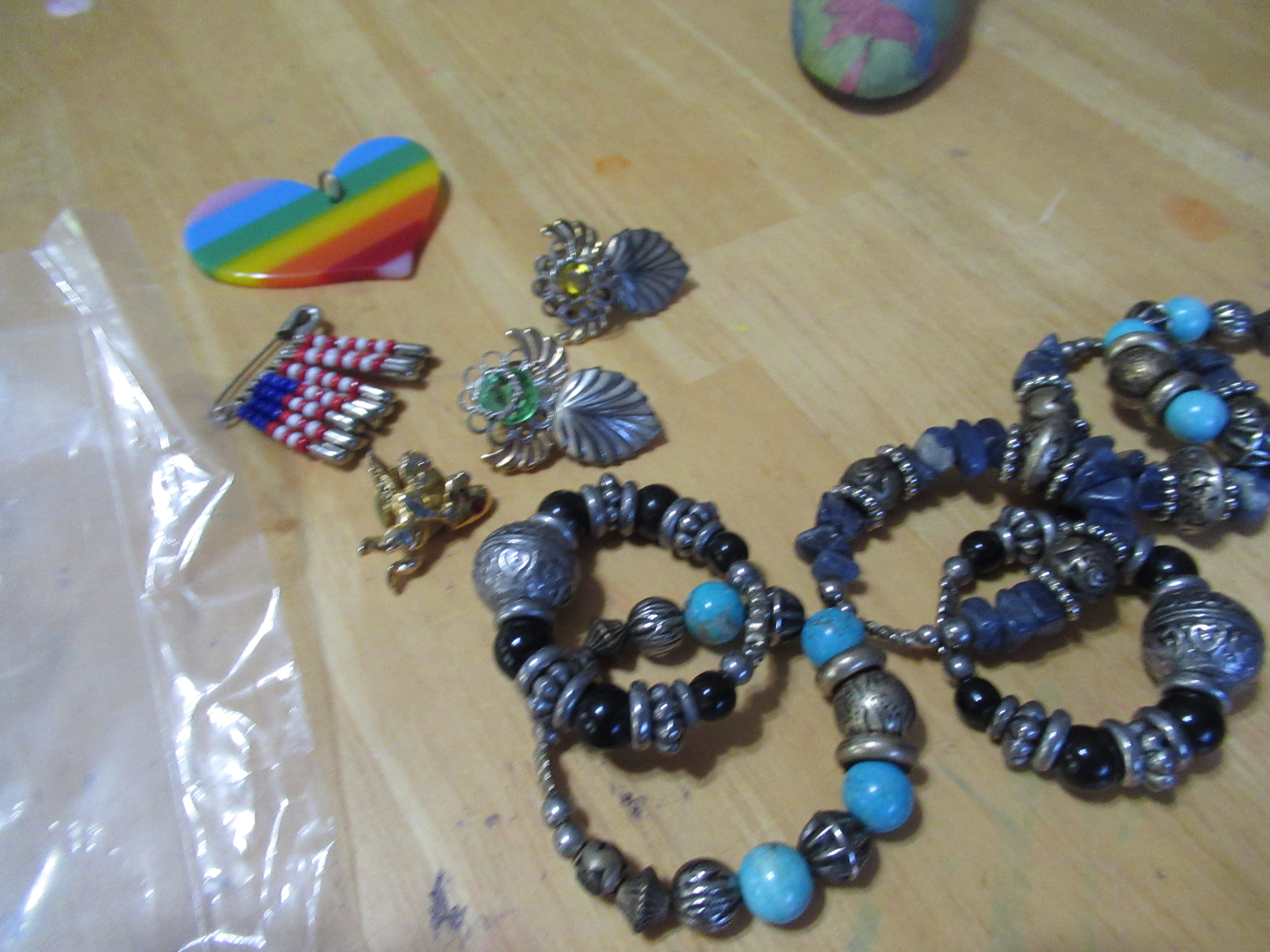 These were actually two lots, the angels, flag and heart were one bag, the napkin rings another. for a buck each, I thought they were worth it. That heart is actually a very nice quality piece. It was not cheap kid stuff , so that is nice. The angels are not bad, a bit worn but fun for projects and the flag is all made from safety pins and seed beads !! The rings are plastic beads, but the metal coated plastic ones are great for southwestern projects and hold up pretty nice. Both are pretty good for a buck each.