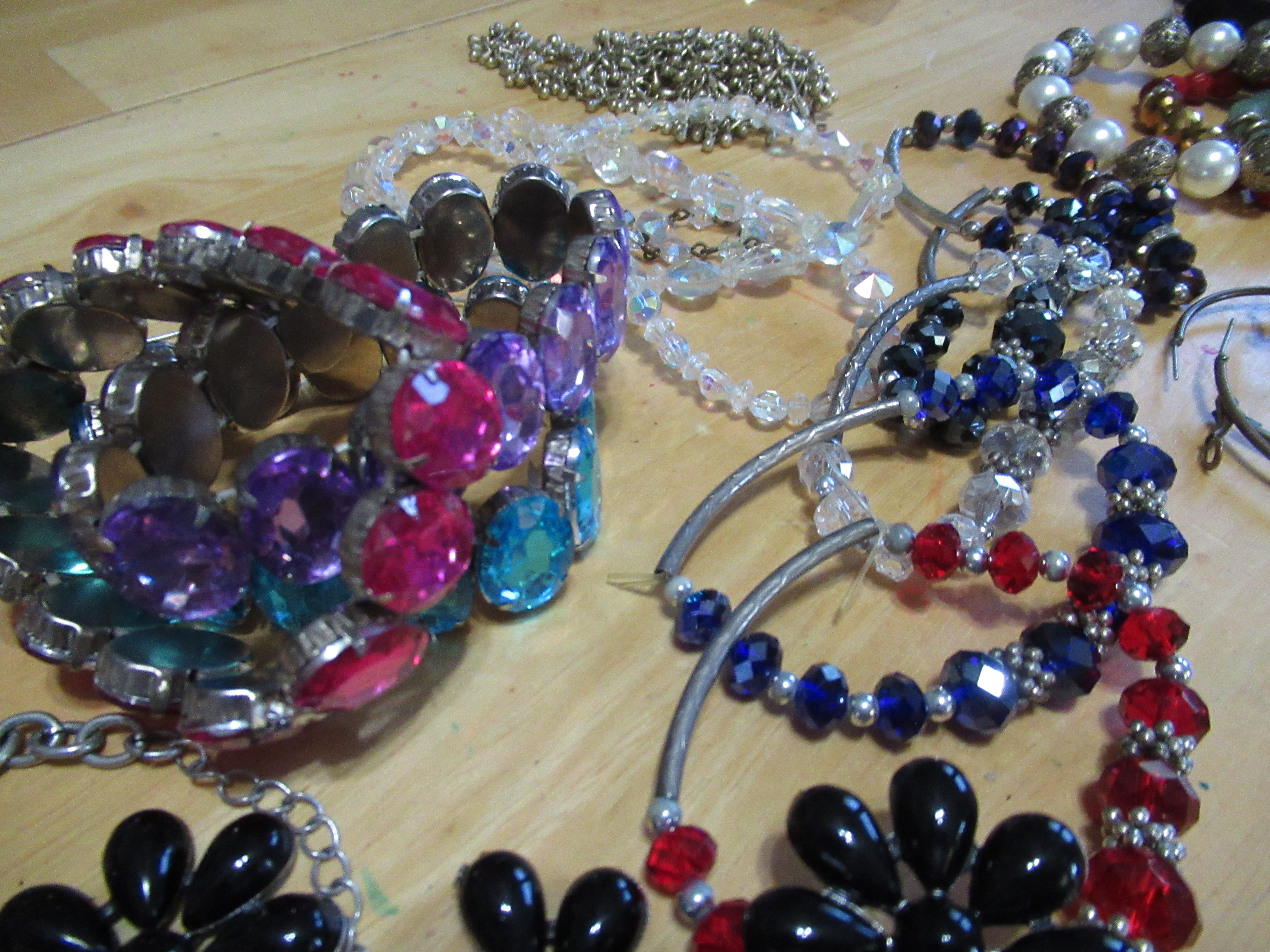 Look at those gorgeous rhinestone bracelets, they are just strung on elastic, so easy to take apart !! I bought them and the vintage crystal necklace behind them at a local antique shop.