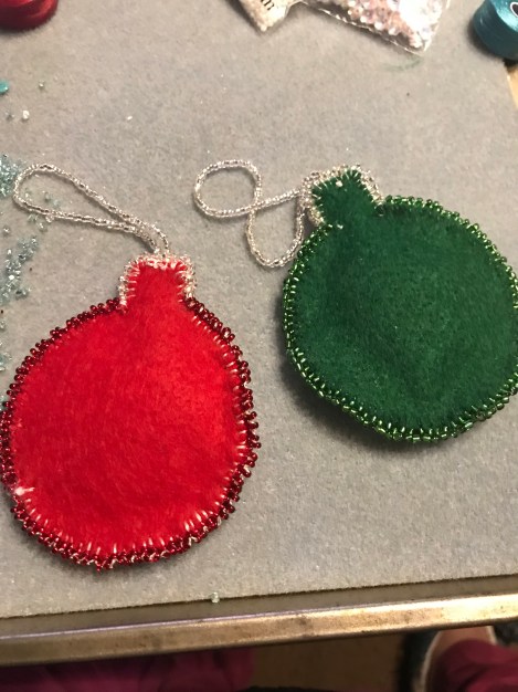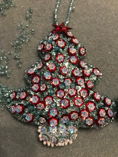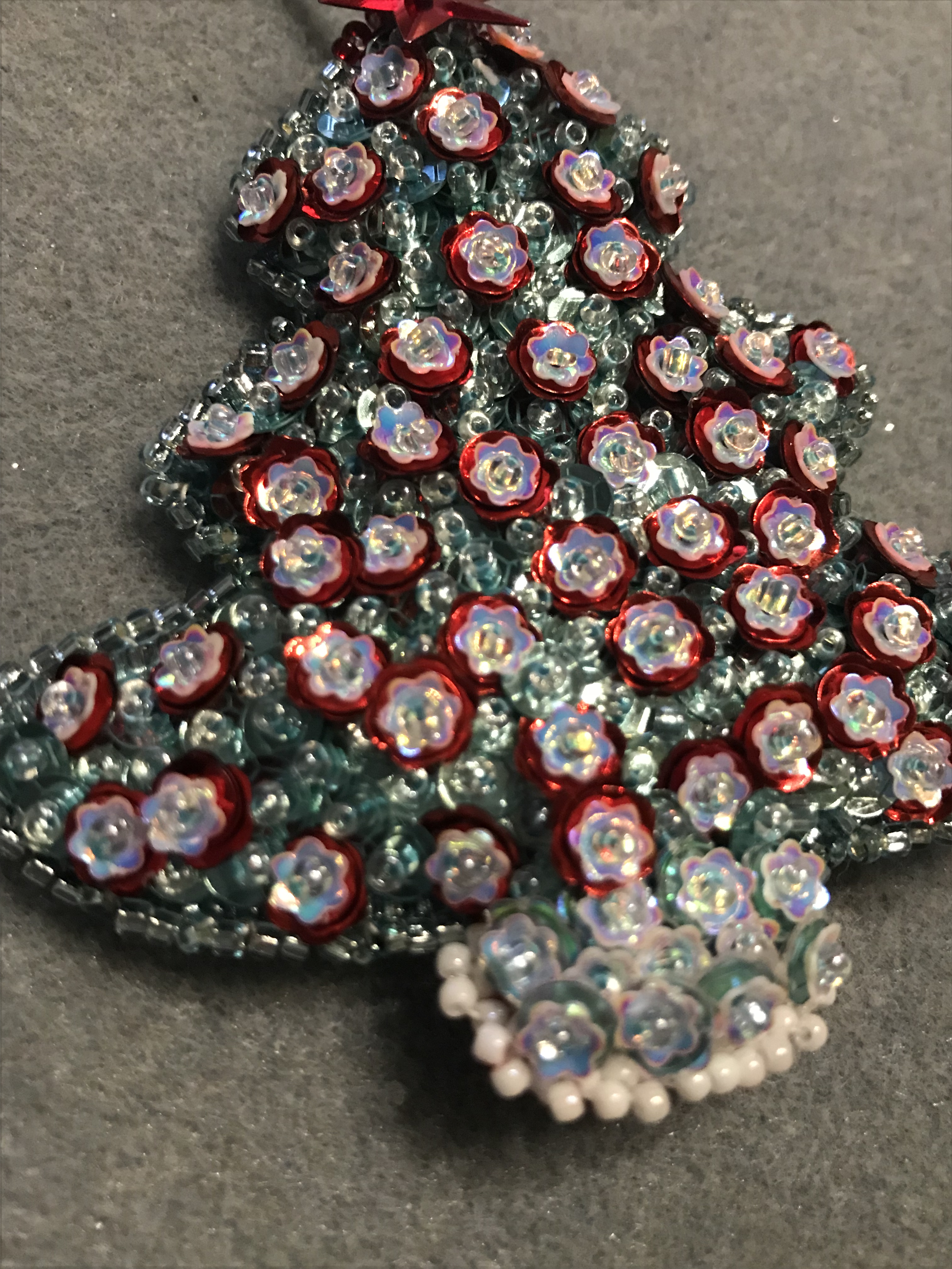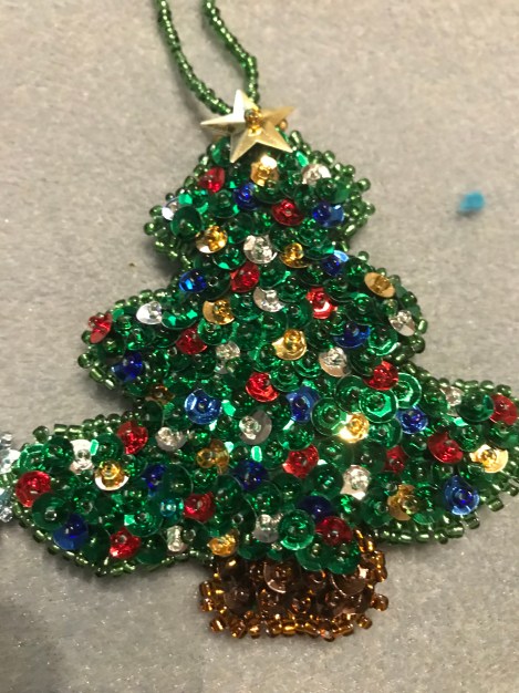 I tried a new ornament I’ve never done based on some vintage ones I found it at a yard sale that didn’t have backs on them. So I made to the first one didn’t come out good and I figured out how to make it look right into the second one. The next set I did were two Christmas trees a traditional green one, and then I use I tried a new ornament I’ve never done based on some vintage ones I found at a yard sale that didn’t have backs on them. So I made to the first one , I was not happy wit it , it didn’t come out good , did not look round , and then I figured out how to make it look right on the second one. The next set I did were two Christmas trees a traditional green one, and then fir the second one I used some vintage blue metallic, and some red metallic sequins I’ve had for close to 30 years. I added some blue silver lined beads I have also had for 30 years !! I did layering of the sequins for the red ornaments. I am happy with how they came out.