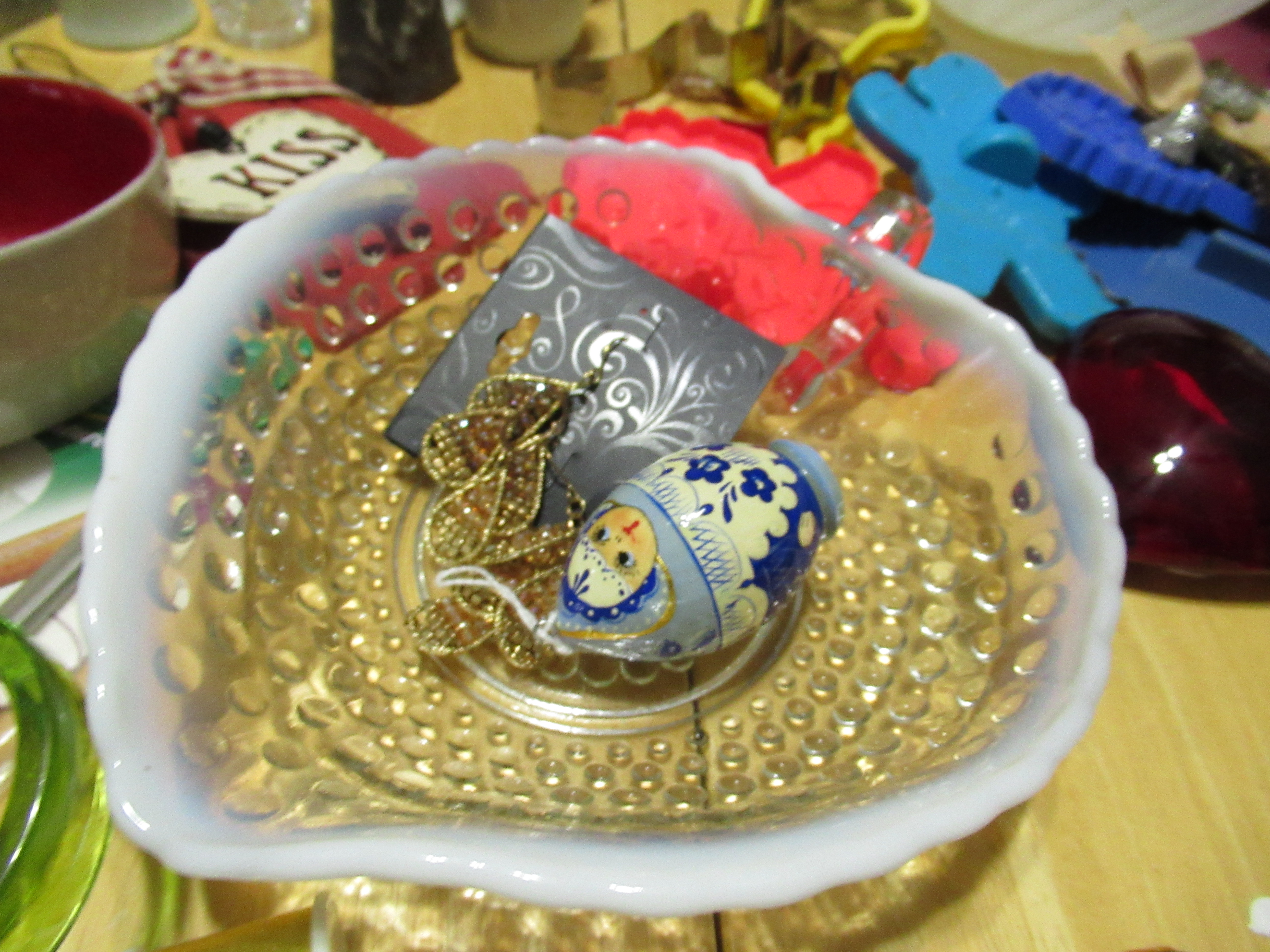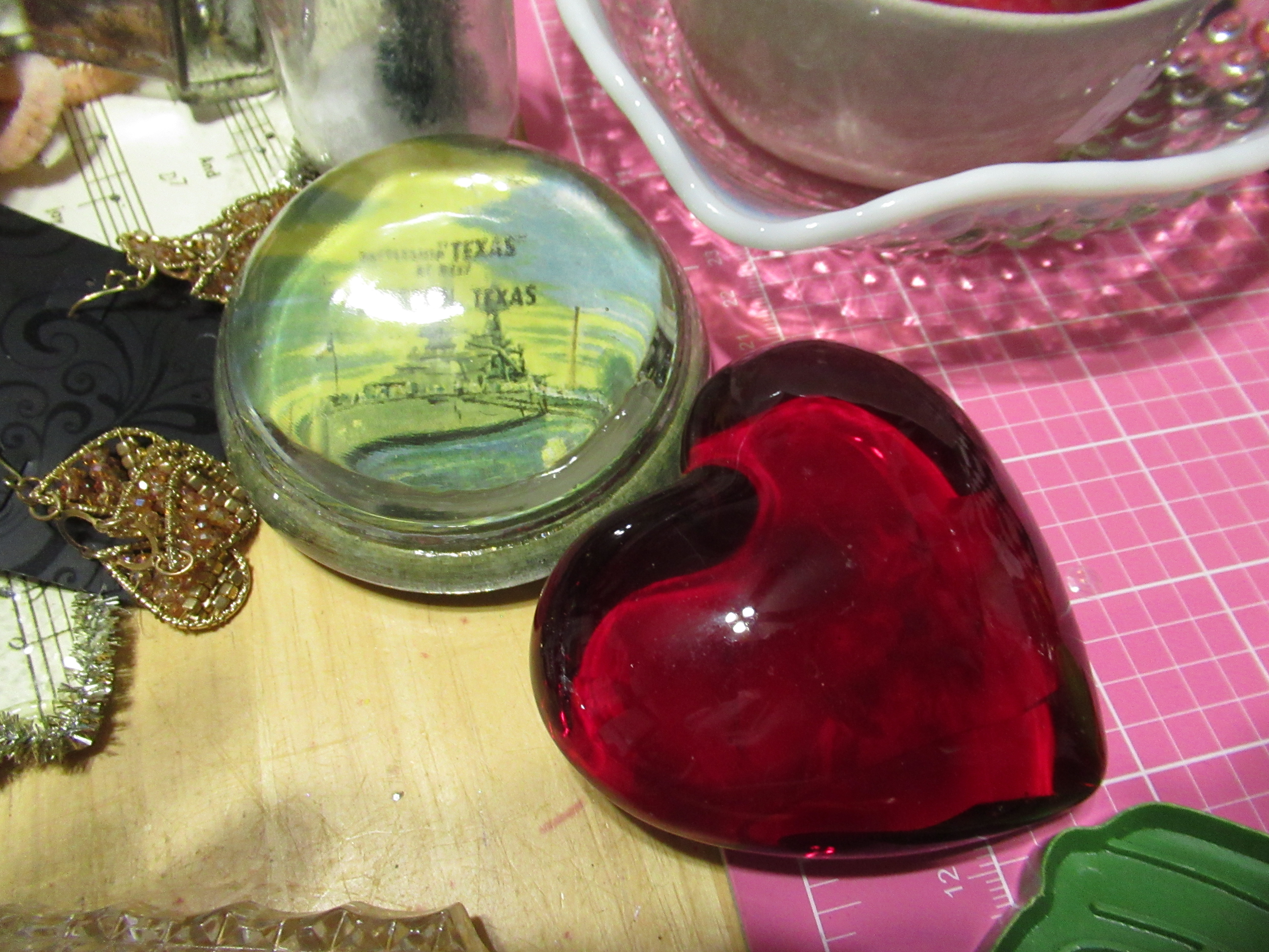 A vintage paper weight and a modern heart one. some earrings and a gorgeous bowl.