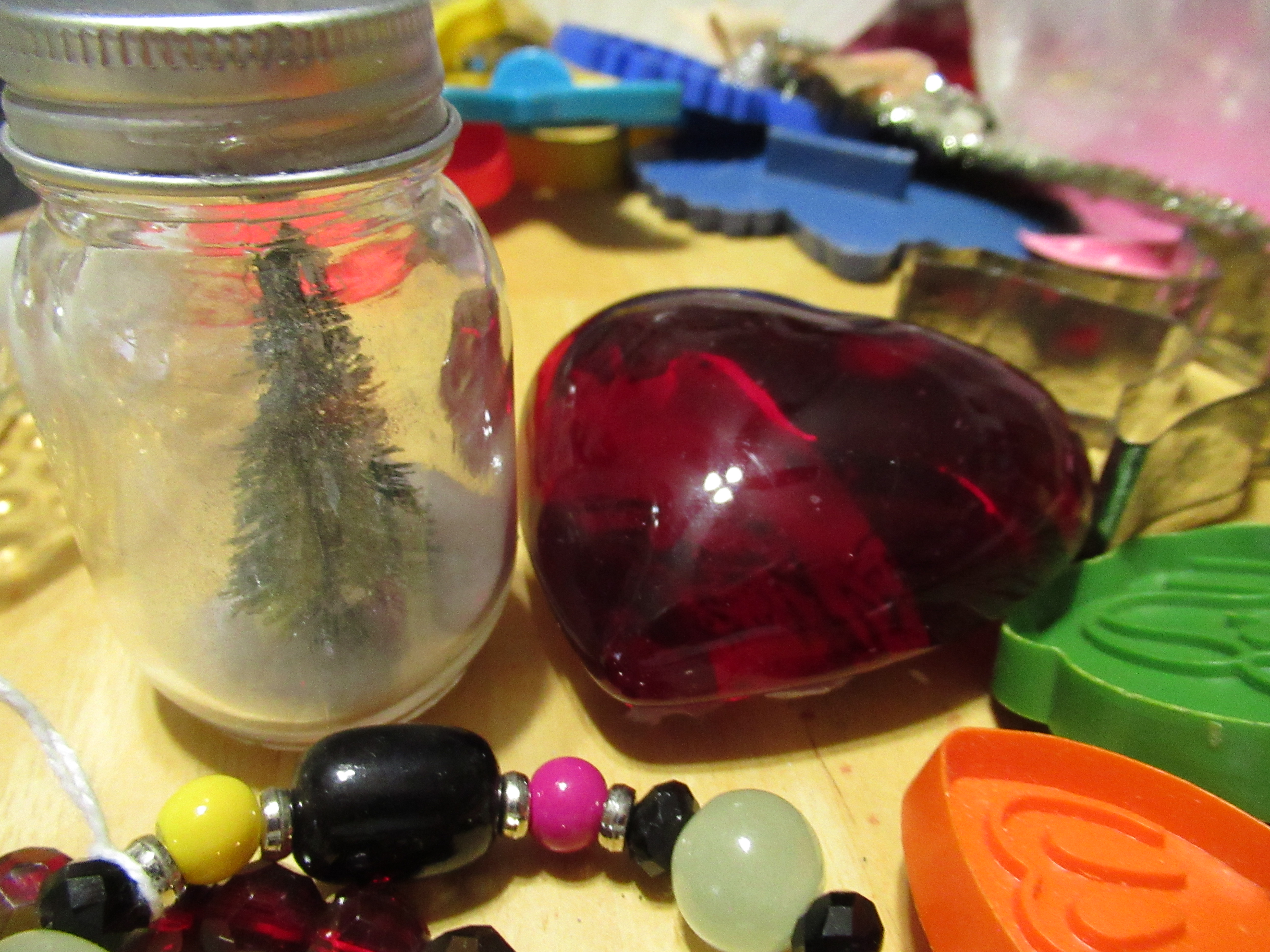 a cute tree I want to improve upon, this one gets all dusty and you cannot see inside. Heart paperweight and other things shown above.