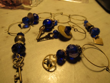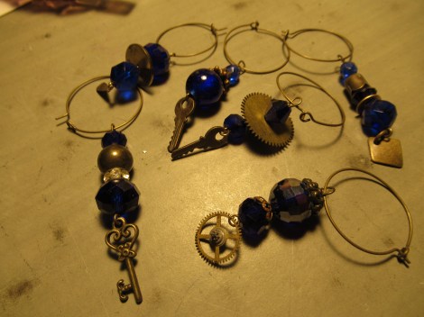 Steam punk wine glass charms. I made three sets, sold two, and decided to keep this one. Loved making them all !!!
