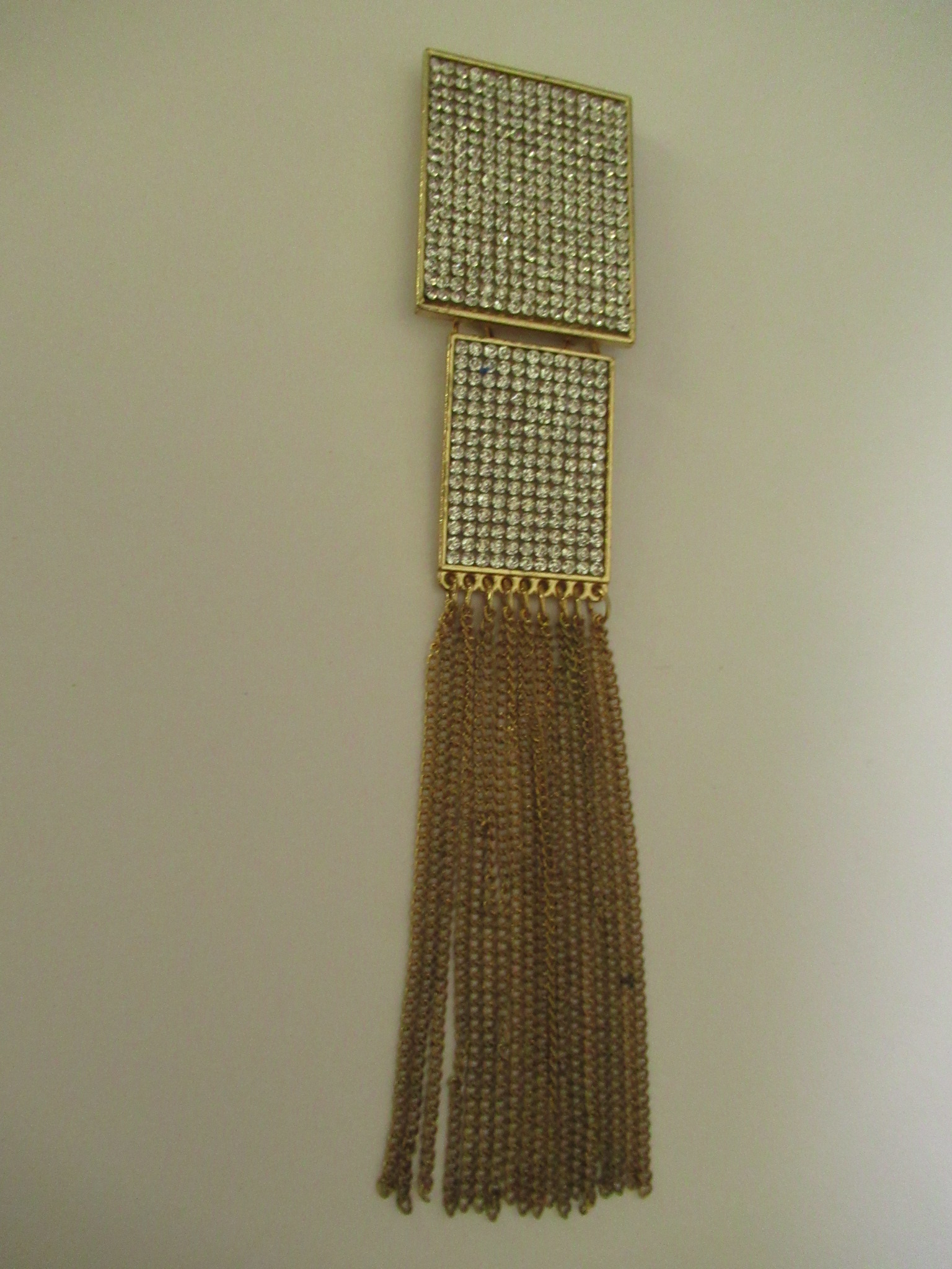 an absolutely gorgeous pendant and it is long, gold and rhinestone with a beautiful gold chain fringe at the bottom.