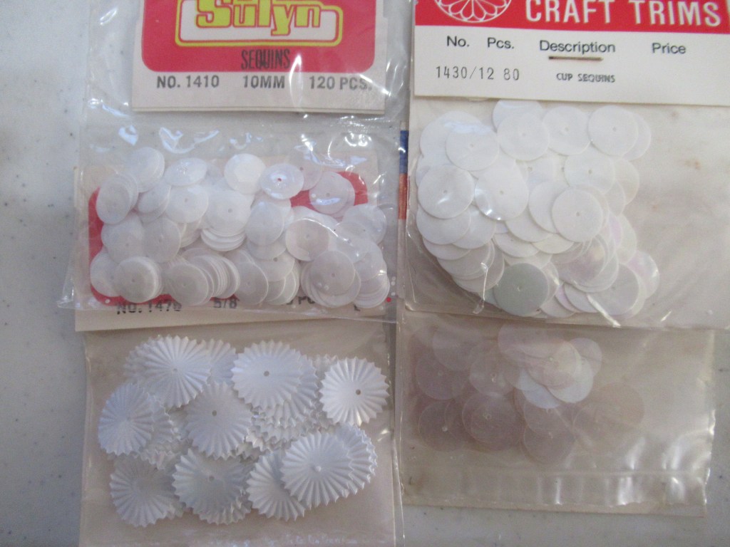 Keep your eyes open as well for big lots of things. I once bought a box of around 20 embroidery kits , most of them new in the package, for five bucks. My husband was not really thrilled, and asked me why would I buy all that , even for five bucks. I told him to trust me and went on to sell around 12 or more of them for ten bucks each. I sold some others for lower prices but made a great profit. He no longer questions me when I buy a large lot. Another time my best friend and I were at an estate sale, it was half price day and they had 81 sequined appliques on a table, I grabbed them all and should have gotten them for .37 cents each as they were priced at .75 . I knew I could sell them for around two to three bucks each. When she added it all up, she only charged me 8.10 for all of them, a dime each. She gave us both deep discounts on everything we bought. I went on to sell around 65 of them for around 2.50 or so a piece and the ones pictured below, are the ones I kept. Some still in the package, some I took out.