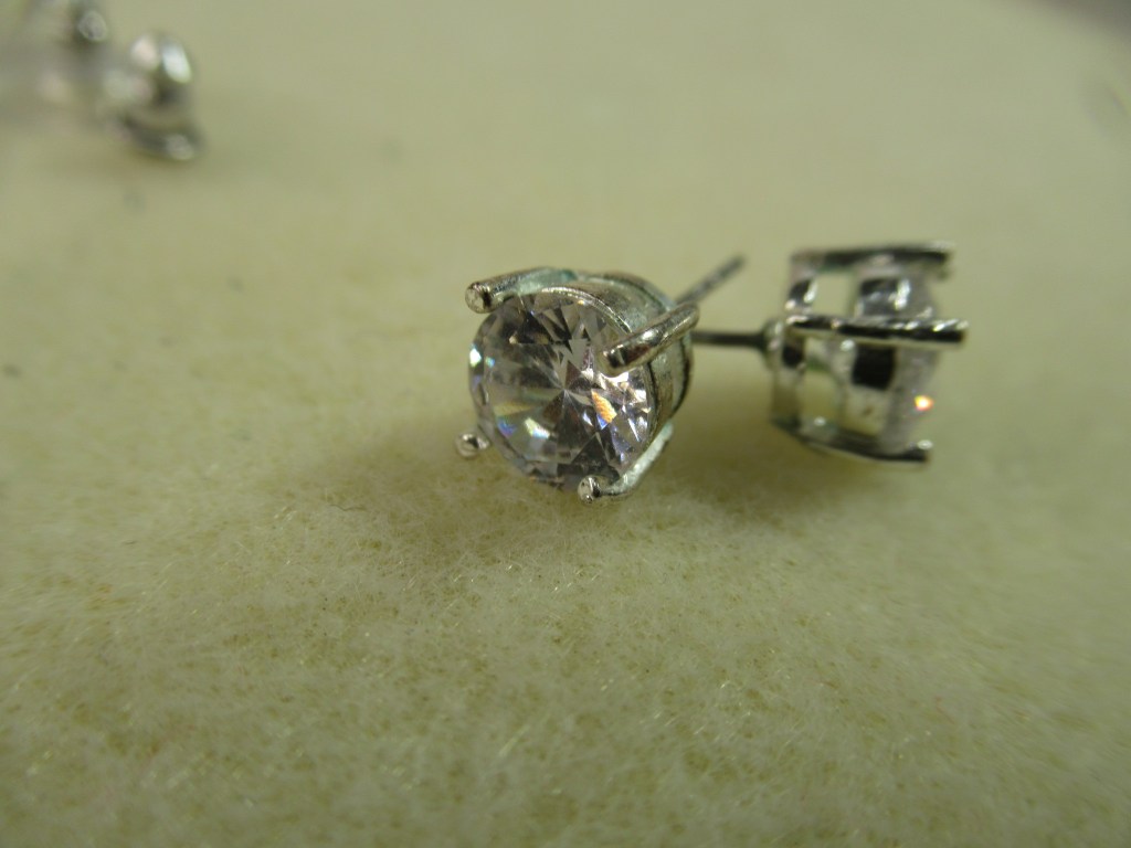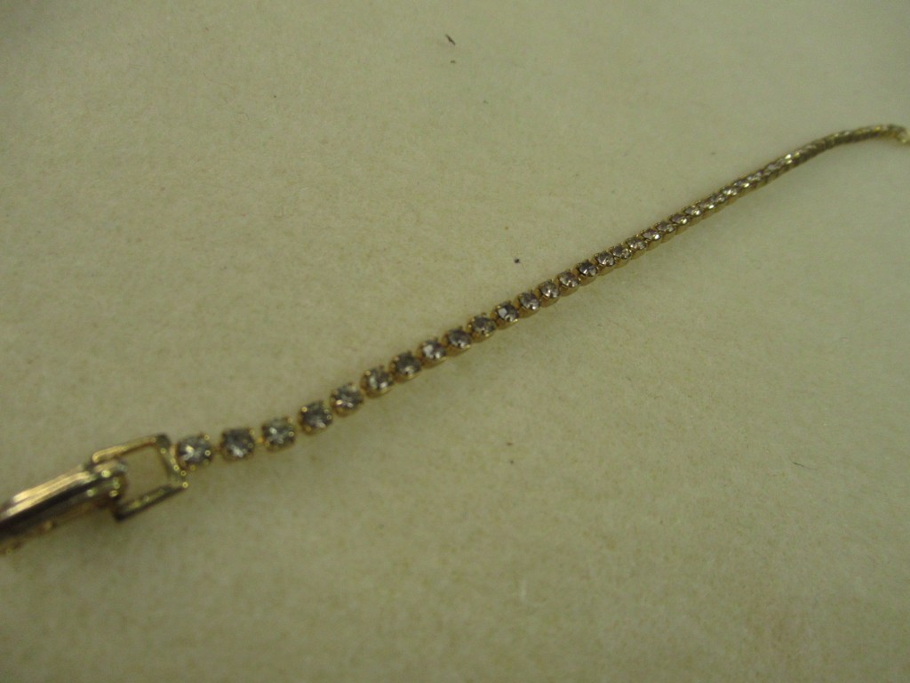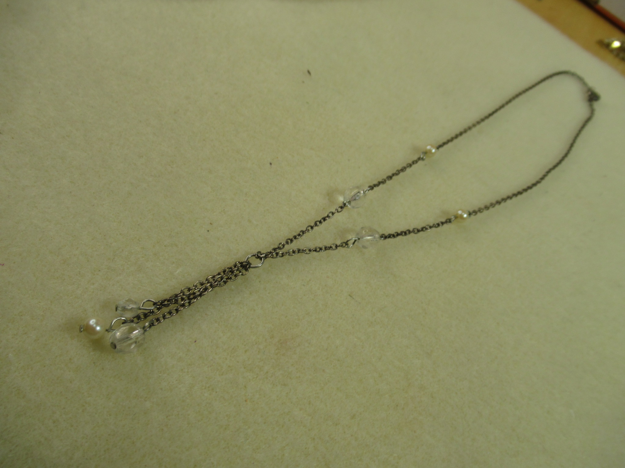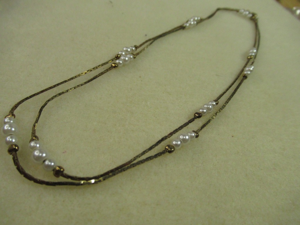 a simple gold chain with pearls and crimp beads, has darkened with age,polishing might help. a pretty pair of stud earrings, a nice CZ a gold rhinestone close chain, light pink in pretty decent shapcute little necklace, very dainty