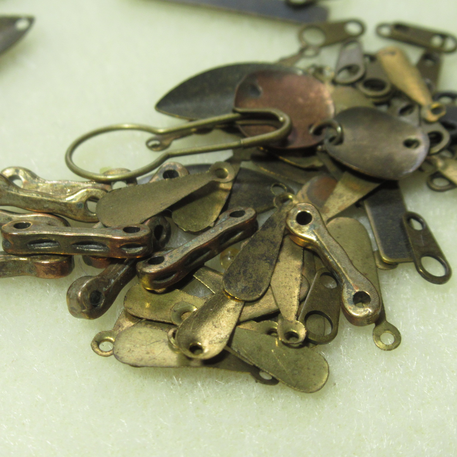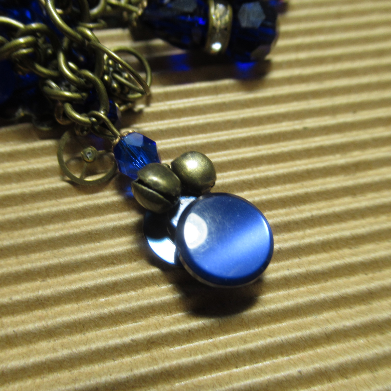 I also used deep blue buttons, stacked on a head pin and embellished with decorative bells, a piece from a broken elastic ring, one of the metal spacers that elastic went through to formed the ring