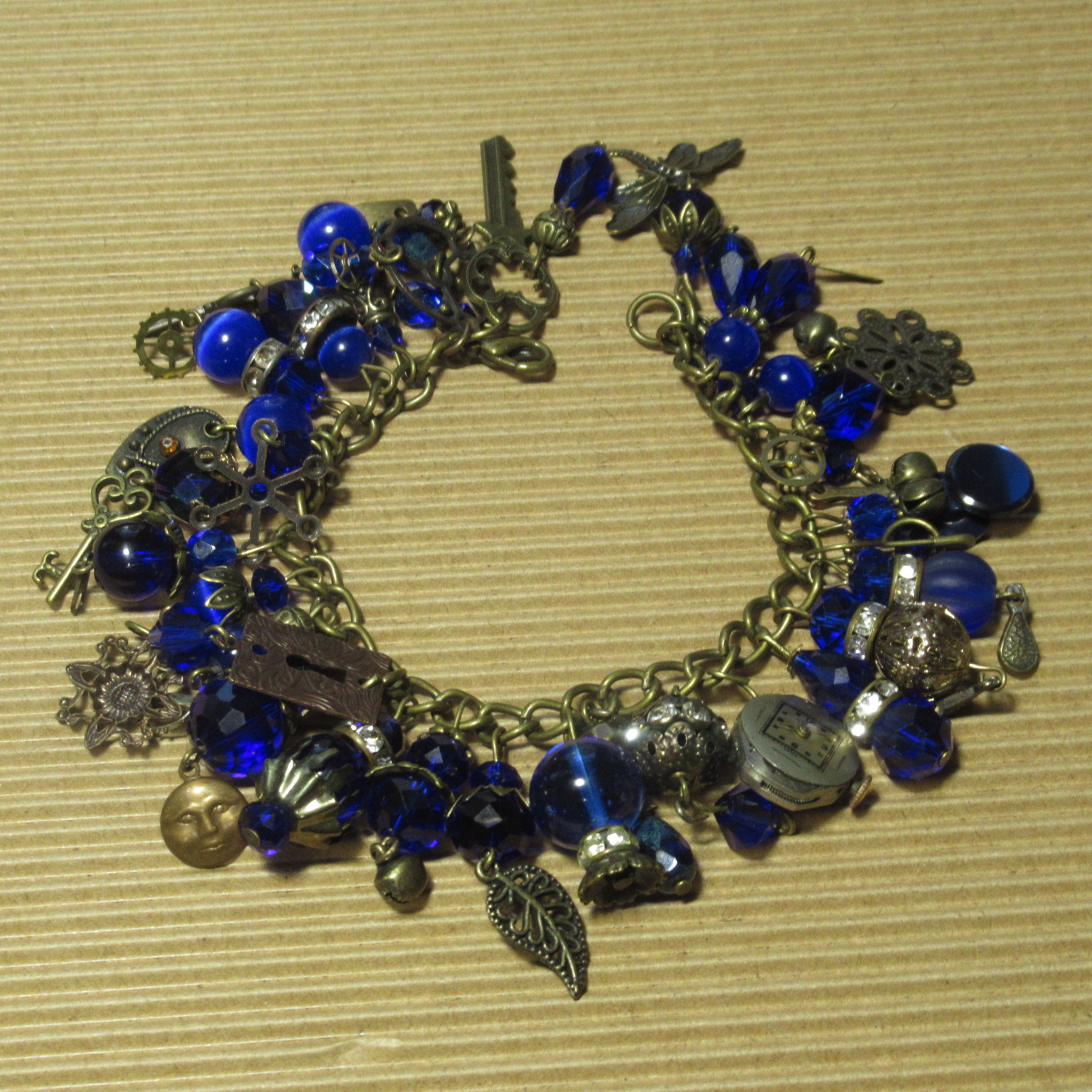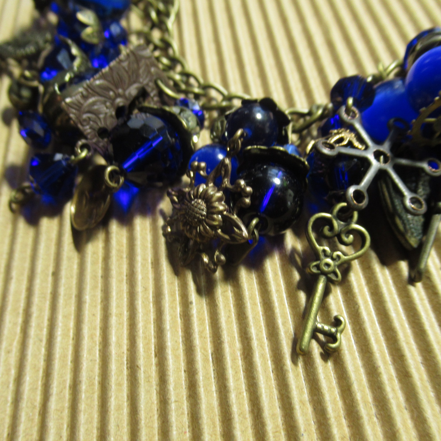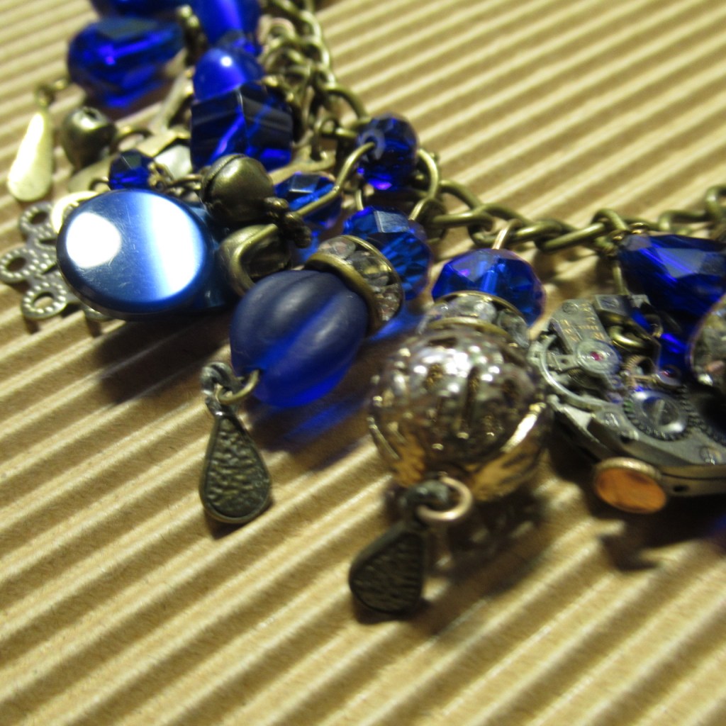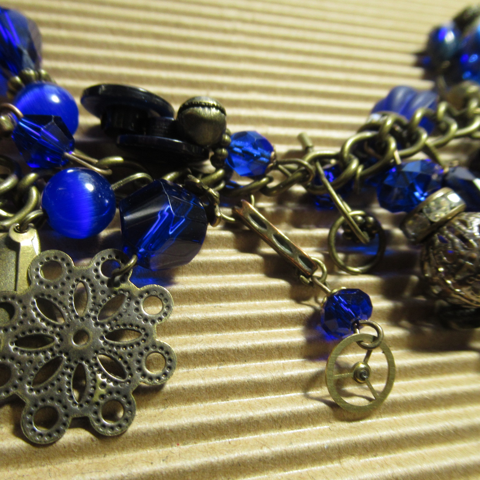 I have been indulging in my love of steam punk jewelry and made up a big tray of beads, findings, and charms. I picked cobalt blue glass beads in different sizes and shapes. Antique brass chain, charms , and findings. Some things were vintage, some were from old pieces of jewelry, some were bought new and used for the first time. I had a 32 link curb chain bracelet blank, so I made up 33 charms. One for each link and one for the jump ring on the lobster claw clasp.