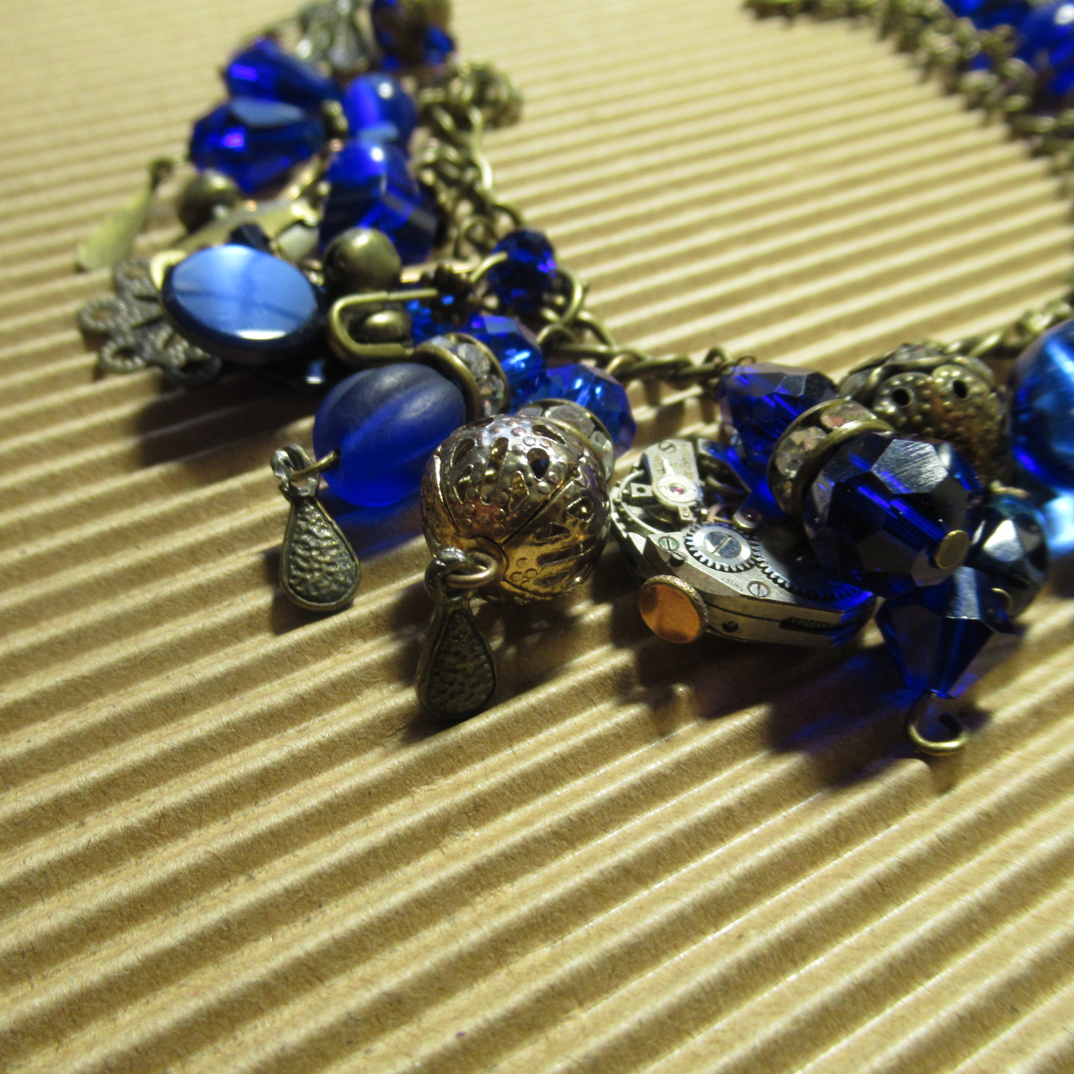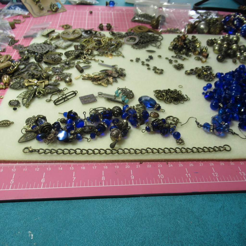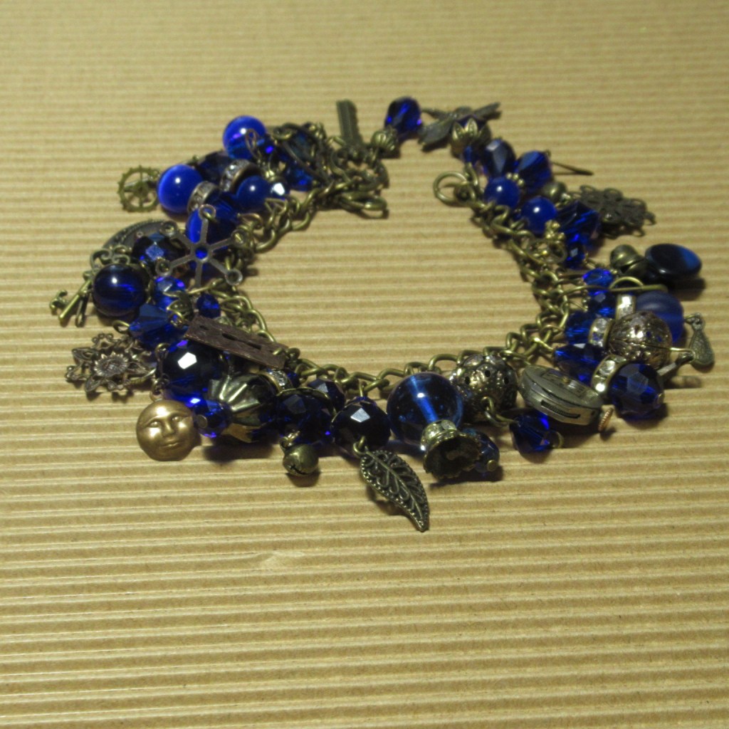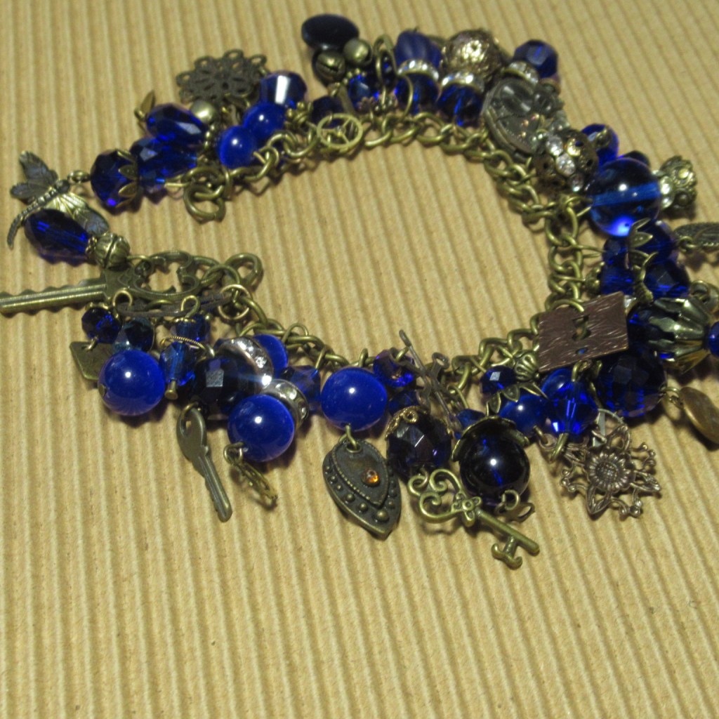 I have been indulging in my love of steam punk jewelry and made up a big tray of beads, findings, and charms. I picked cobalt blue glass beads in different sizes and shapes. Antique brass chain, charms , and findings. Some things were vintage, some were from old pieces of jewelry, some were bought new and used for the first time. I had a 32 link curb chain bracelet blank, so I made up 33 charms. One for each link and one for the jump ring on the lobster claw clasp.