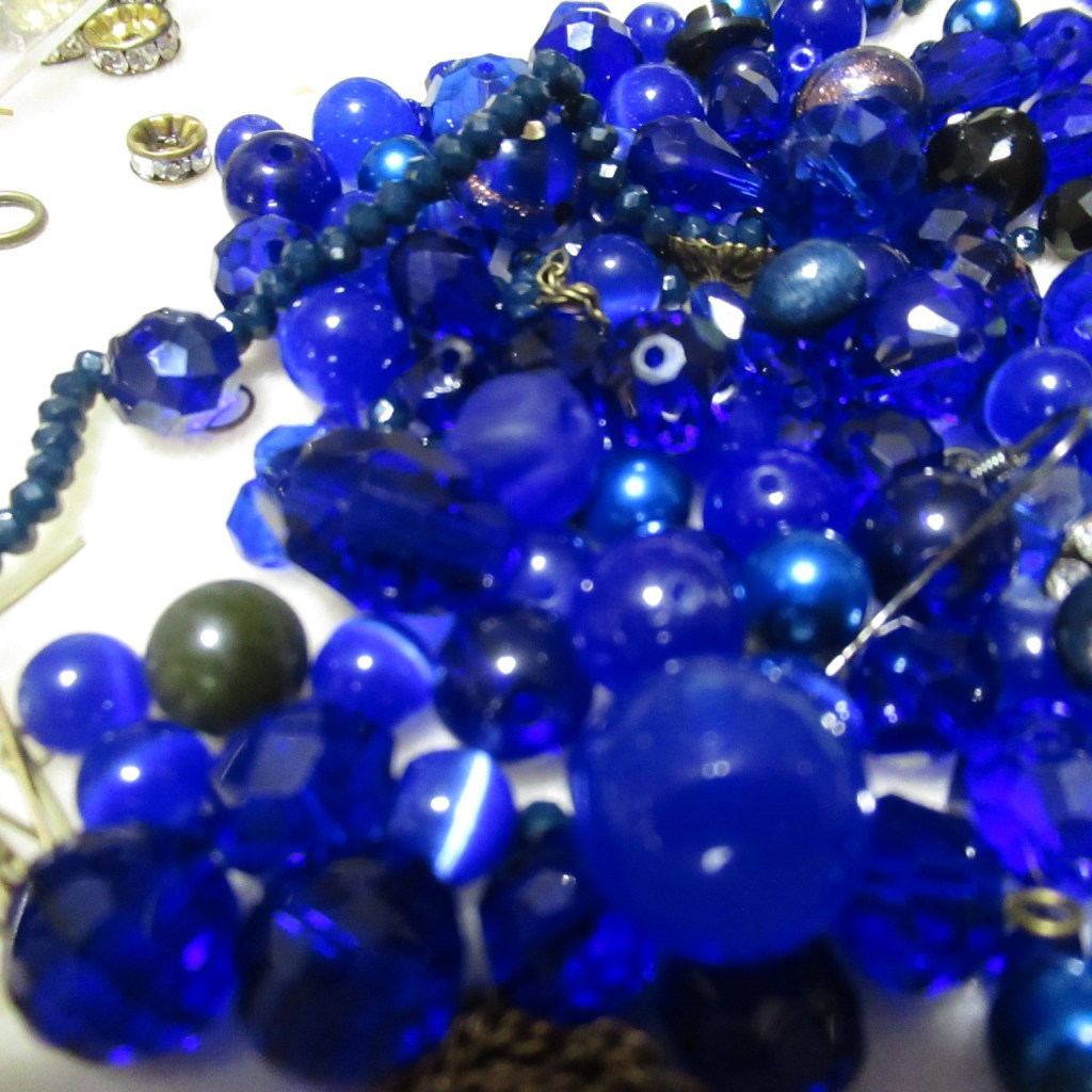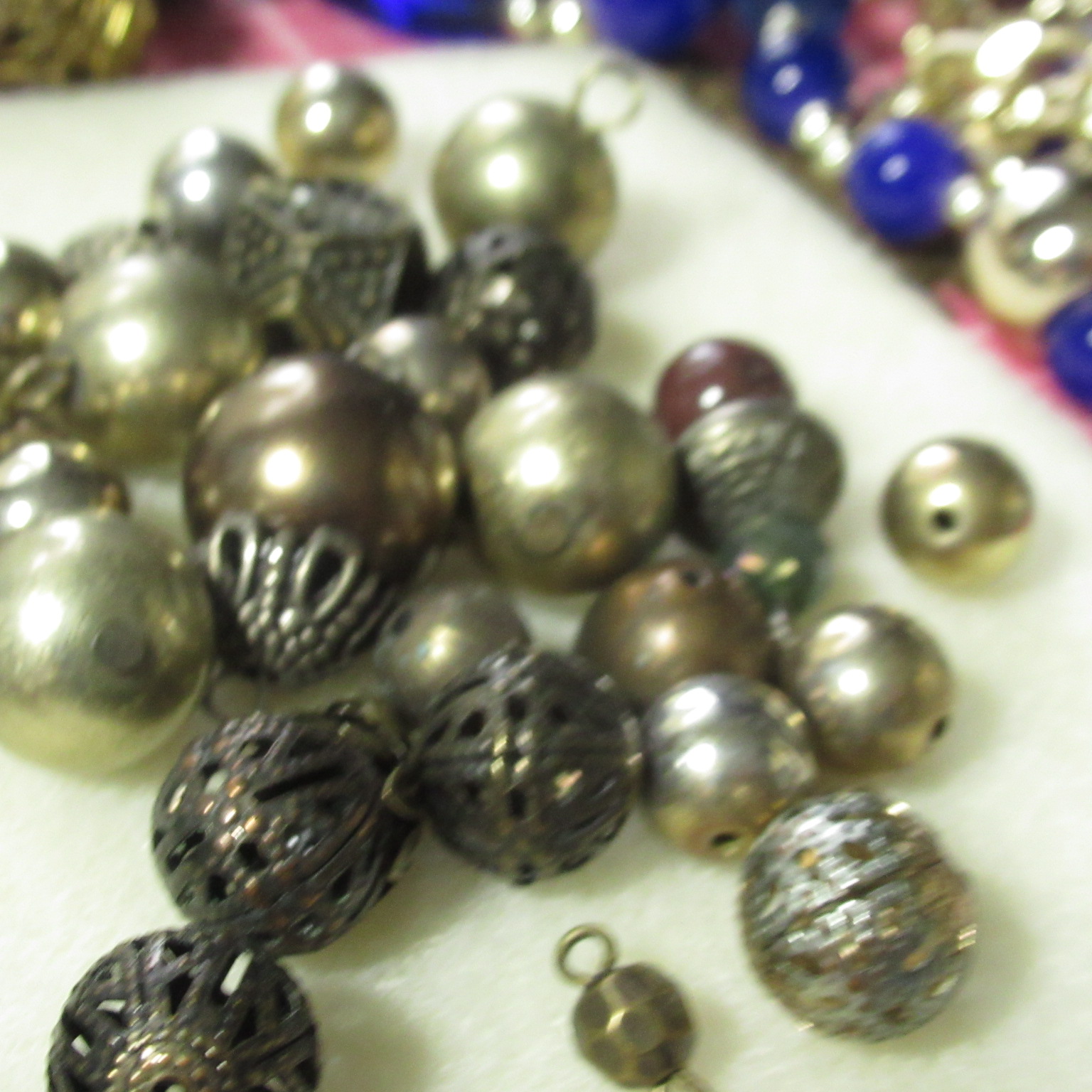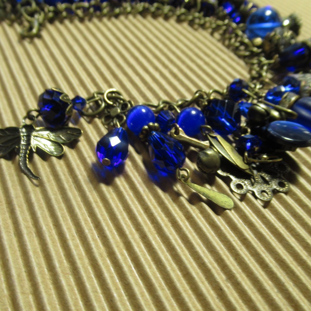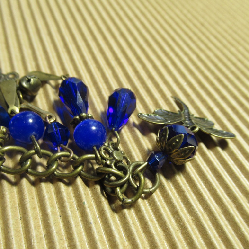 I have been indulging in my love of steam punk jewelry and made up a big tray of beads, findings, and charms. I picked cobalt blue glass beads in different sizes and shapes. Antique brass chain, charms , and findings. Some things were vintage, some were from old pieces of jewelry, some were bought new and used for the first time. I had a 32 link curb chain bracelet blank, so I made up 33 charms. One for each link and one for the jump ring on the lobster claw clasp.