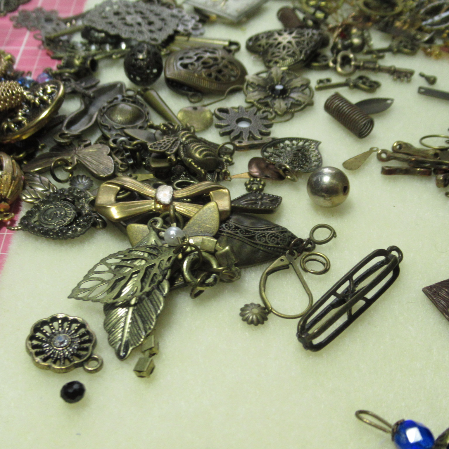 I used antique brass charms, broken pieces of jewelry,buttons, beads and watch parts. I had so much fun making this and did a video which I posted on my channel, Stephies Beads and Baubles, here is a link.
