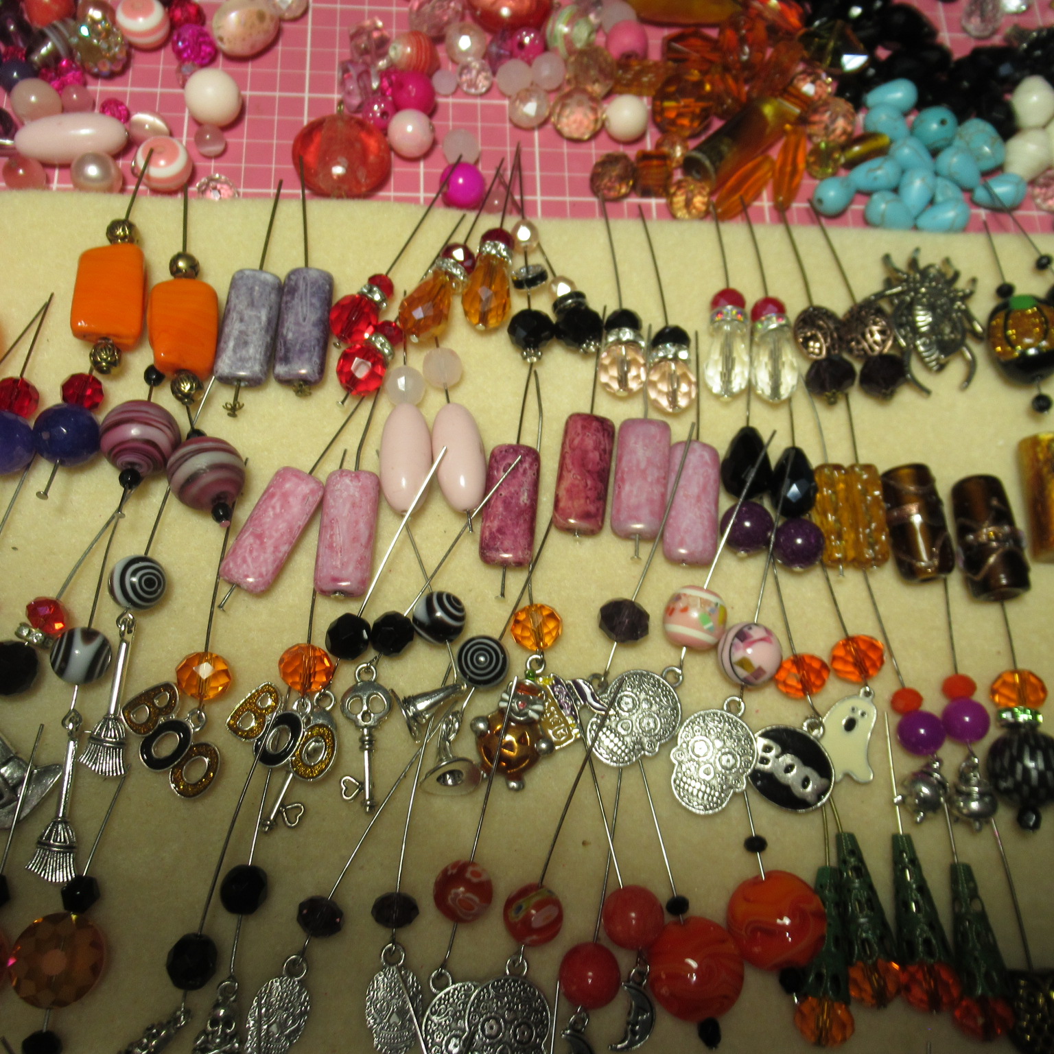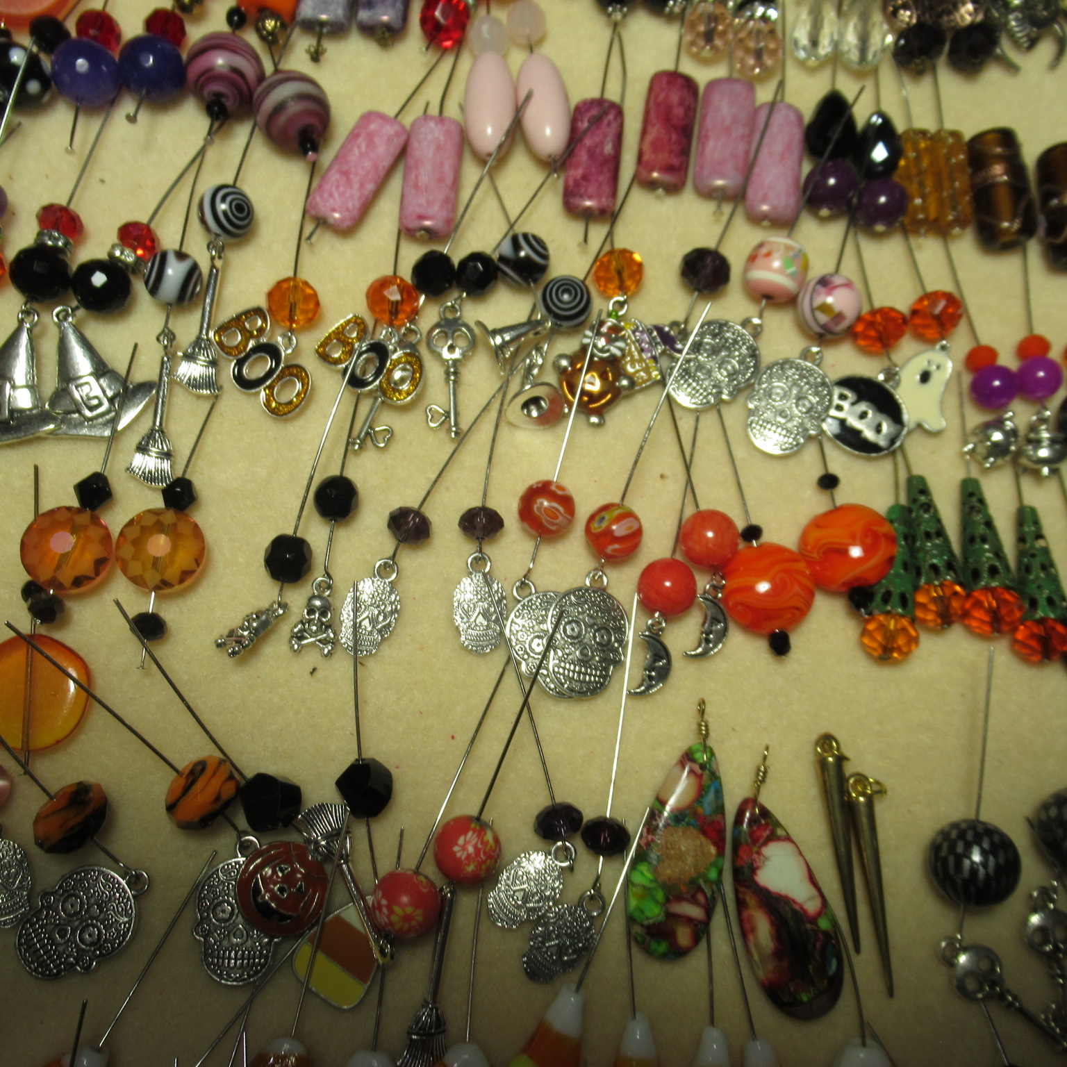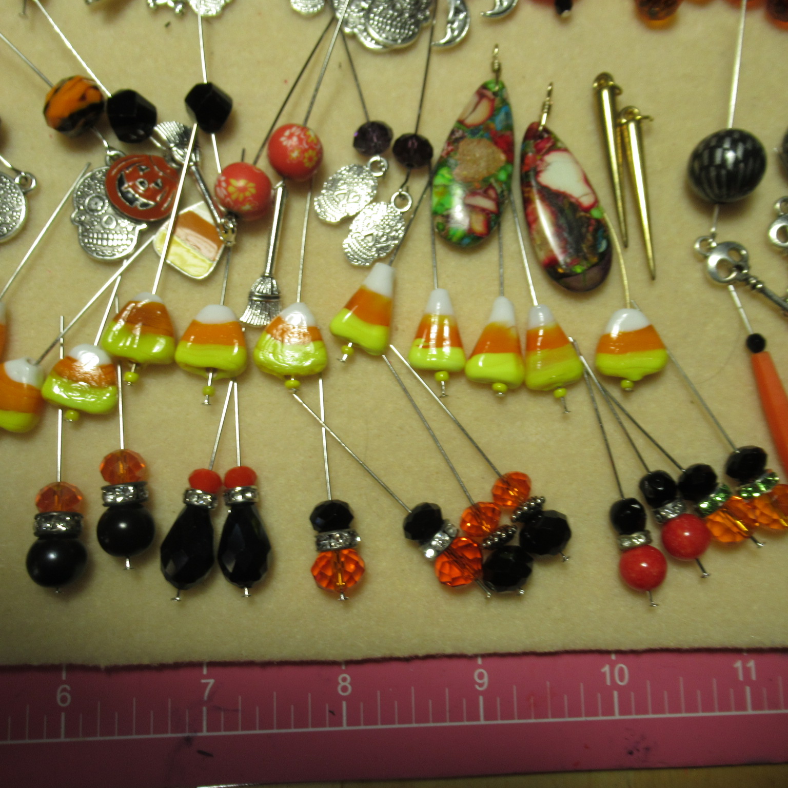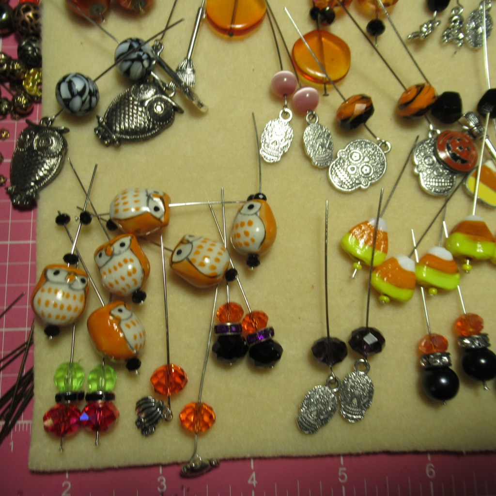 first I string all the beads on the head pins, add any charms , just having fun designing all kinds of different earrings.