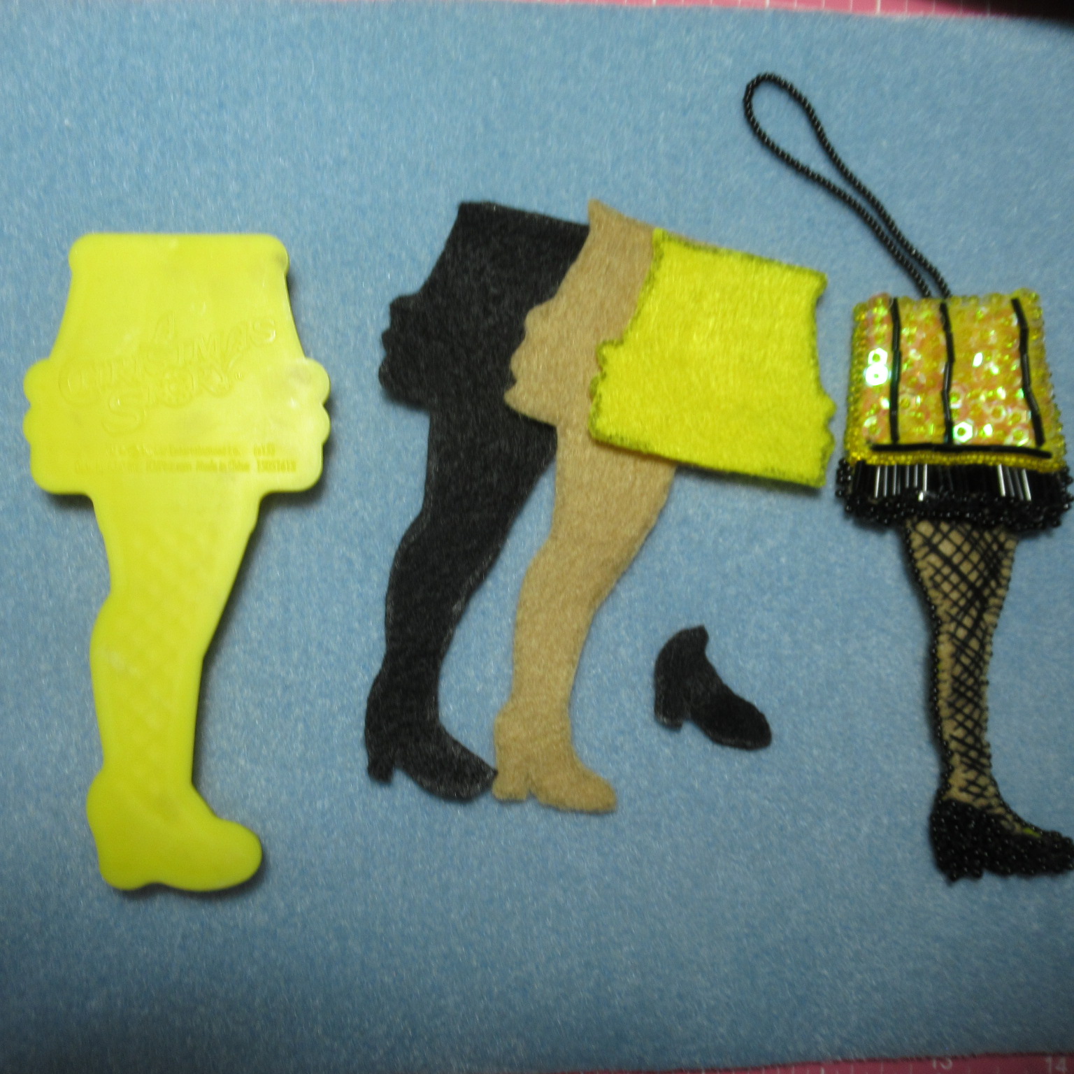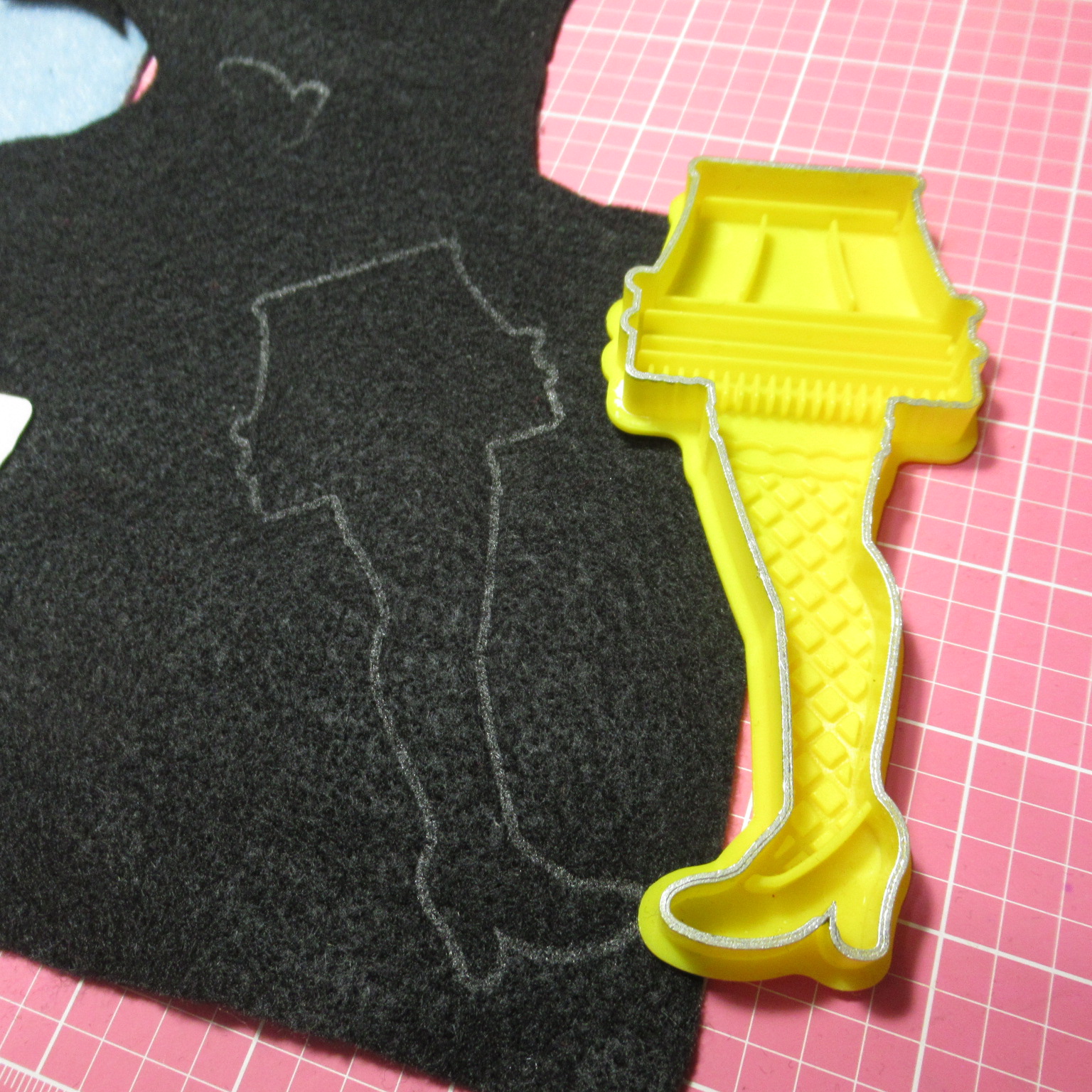 first I take the leg lamp cookie cutter, a ink stamp pad in a color that will show up on the felt, silver for dark, black for light, and stamp the cookie cutter onto the felt, doing seperate ones for the shoes and the skirt and some black or yellow for back, beige for the legs