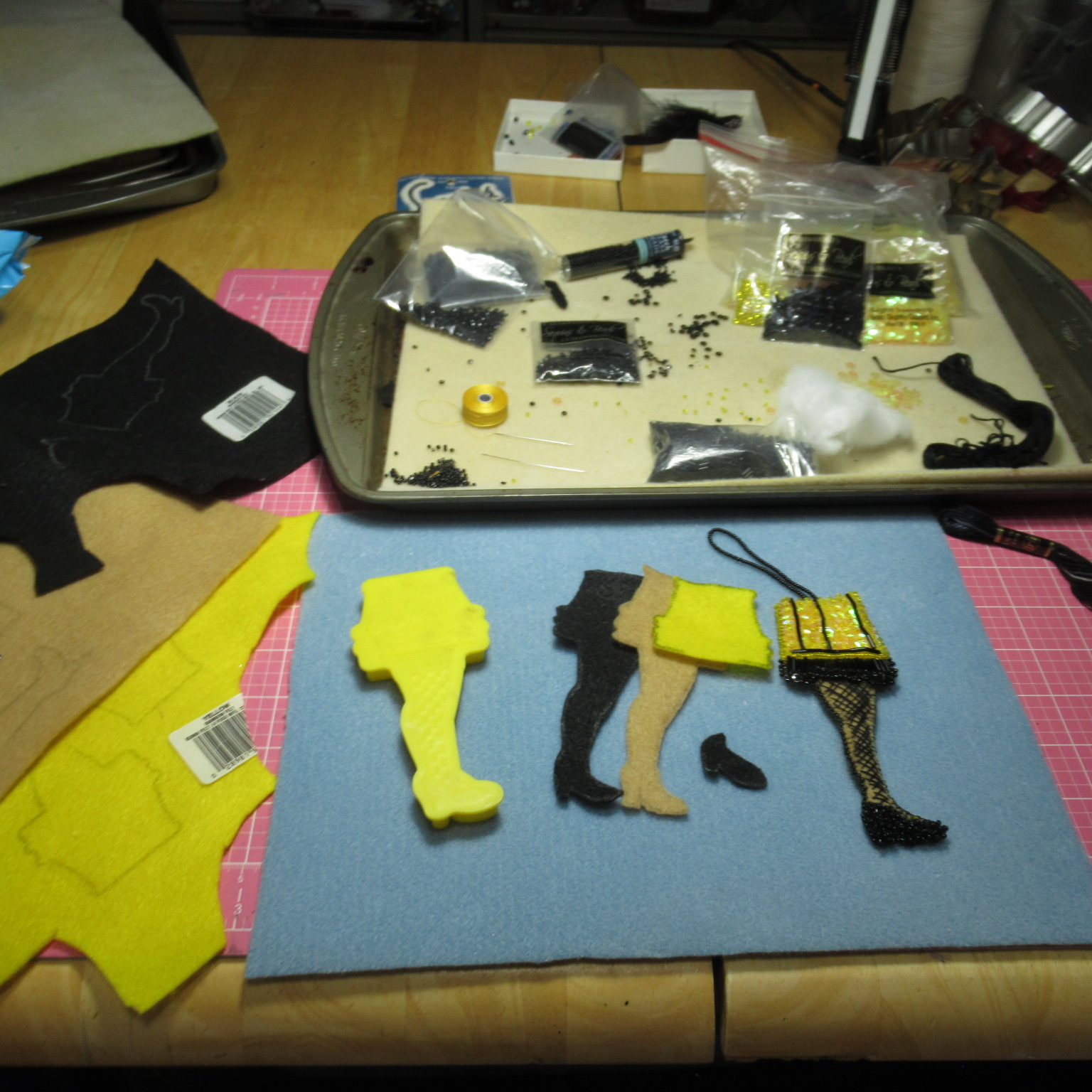 I do the bead work with the skirt and shoe over the beige let cut out, setting the cut out items over the shape on the beige leg so they are the correct clor. You can see all the shapes in the picture above. I do not add the back until all the front is completely finished, then I bead the edges together.