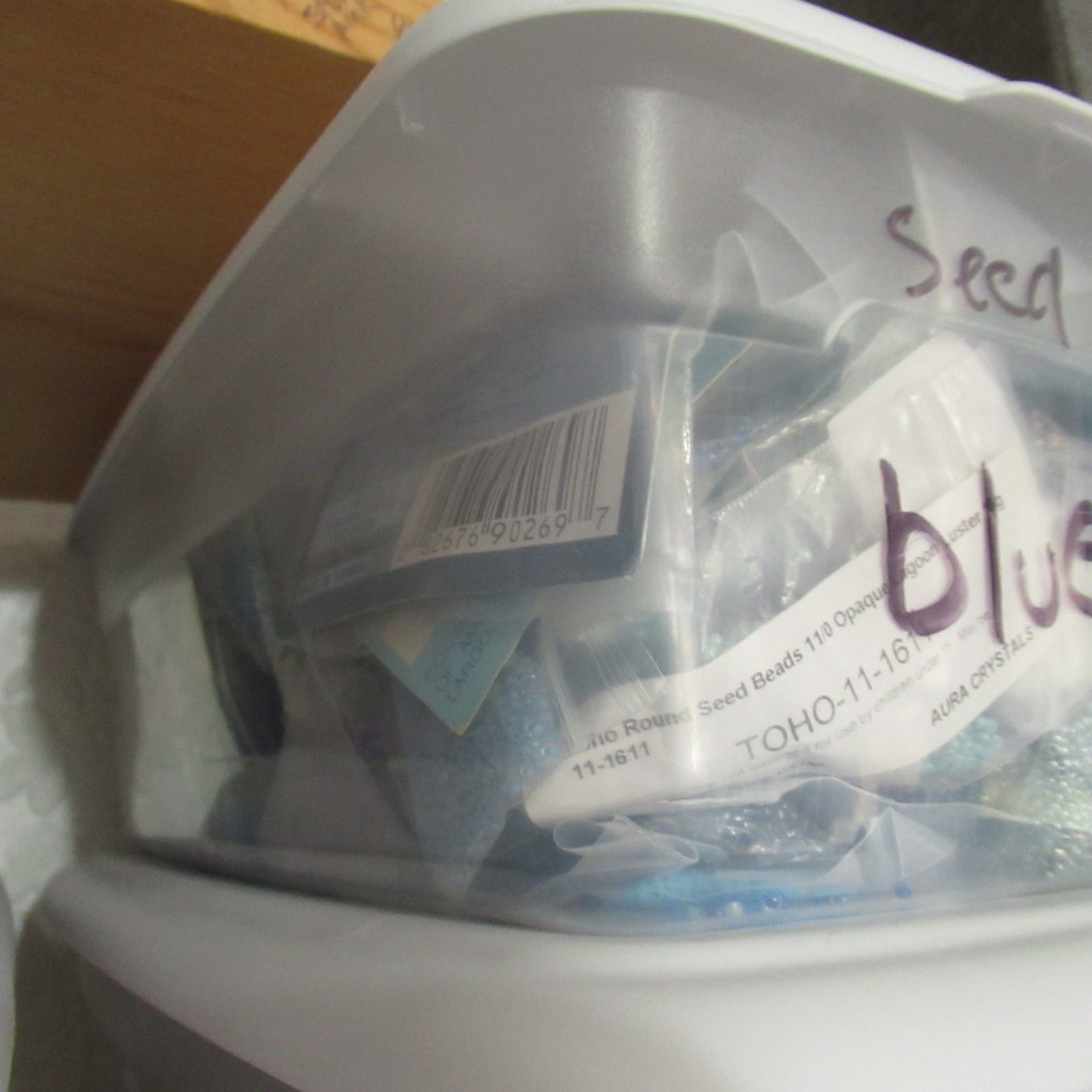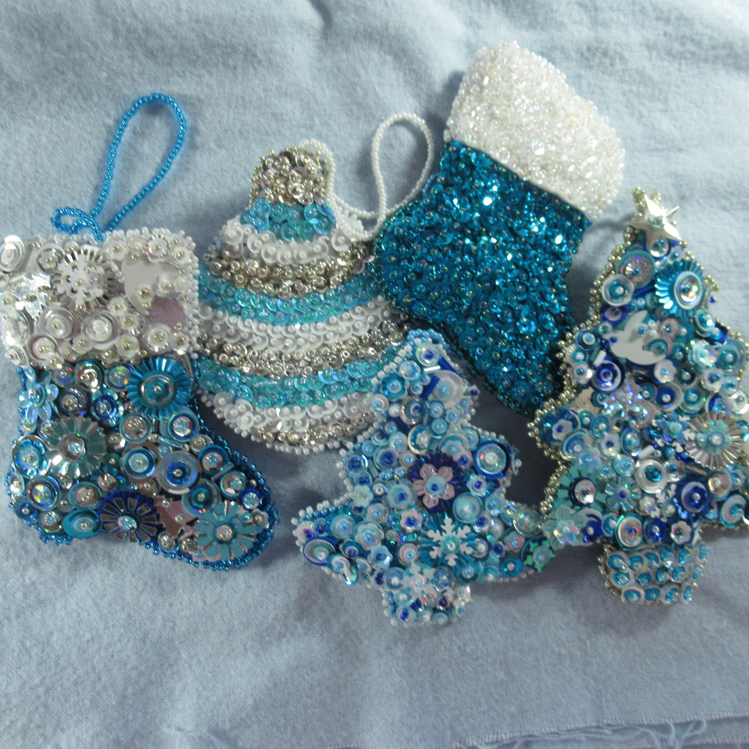 In addition, I went through my extensive collection of blue seed beads and sequins and filled a flat with single colors of both,for the ornaments that will not be stacked.