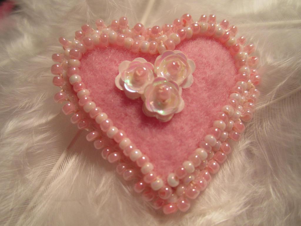I put a row of alternating white and pink seed beads all around the heart .